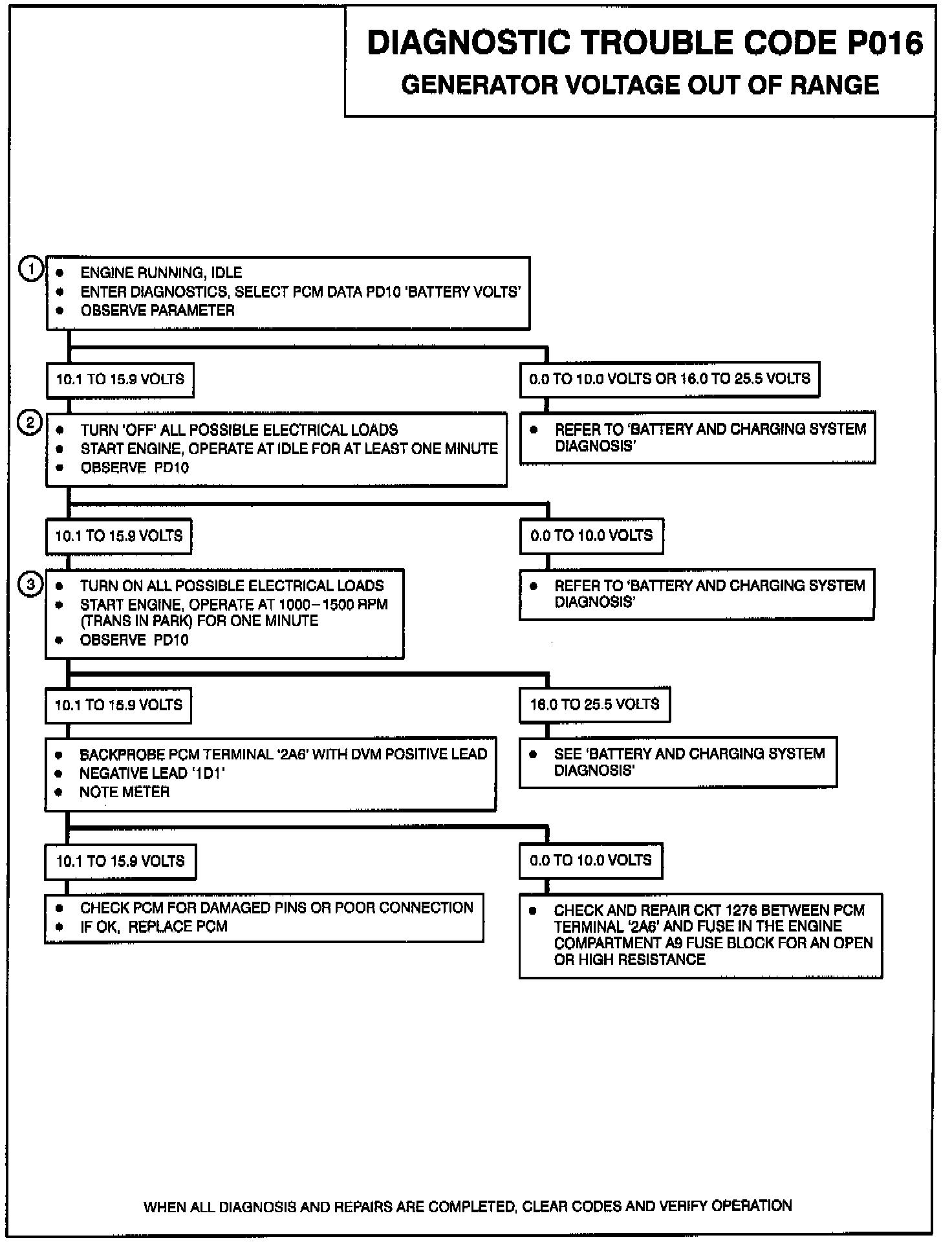 1. Check PCM Data for parameter PD10. If the voltage is 16 volts or greater is an indication that the generator is not controlling voltage.