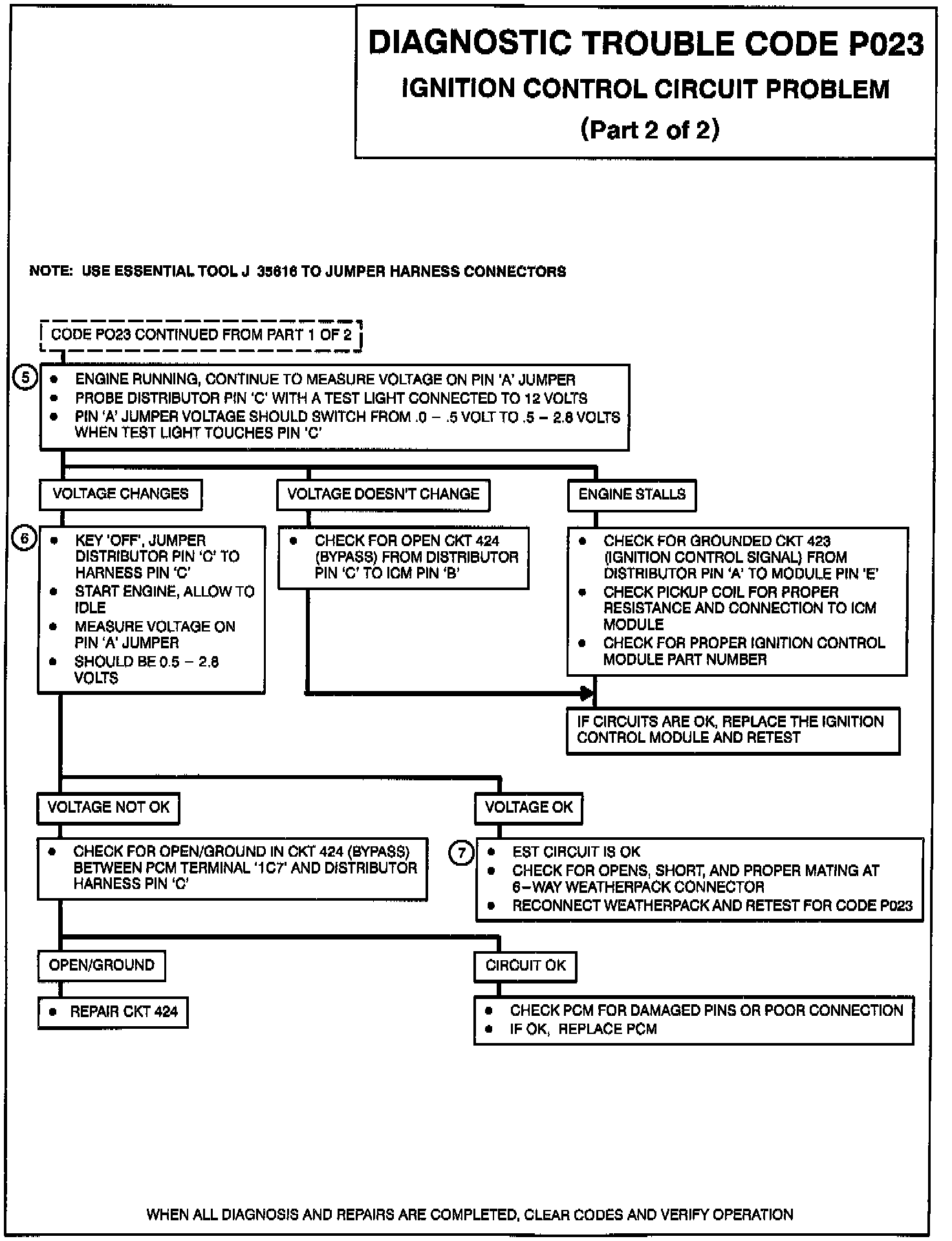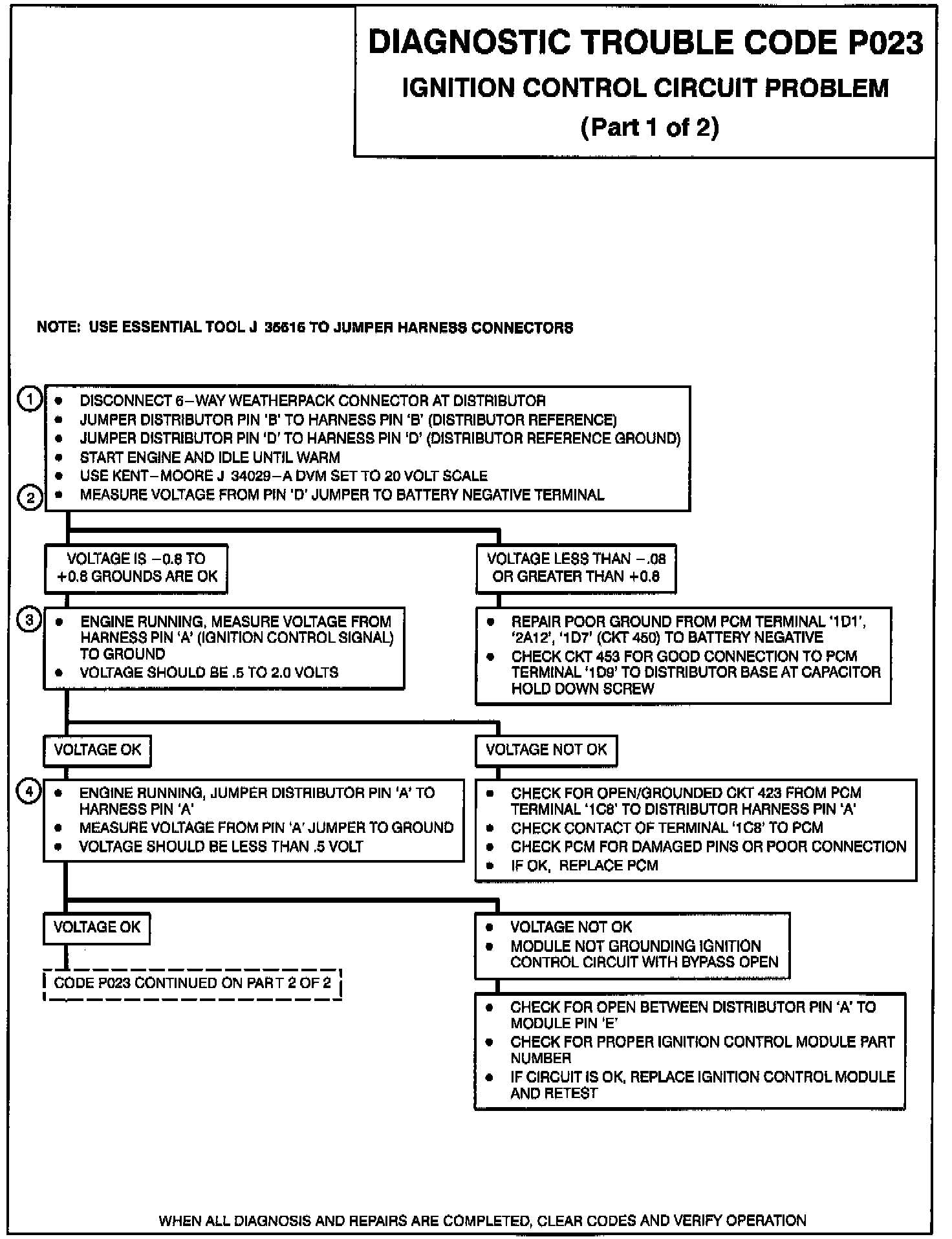 For complete direction of how ignition spark is controlled by the PCM and the Ignition Control module, refer to Section 6D4. Code P023 will set under either of the two following conditions: