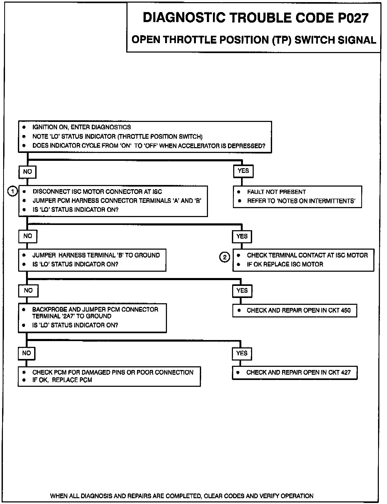 The diagnostic test monitors the Idle Speed Control (ISC) throttle position switch during some coast down and idle conditions with the throttle position switch open and brake applied. Under these conditions, the PCM commands the ISC to retract and monitors the TP sensor for a corresponding decrease in throttle position. If the PCM detects a decrease in throttle position two times in succession, then the PCM knows the throttle is resting on the ISC plunger and the throttle position switch should be closed and it sets Code P027.