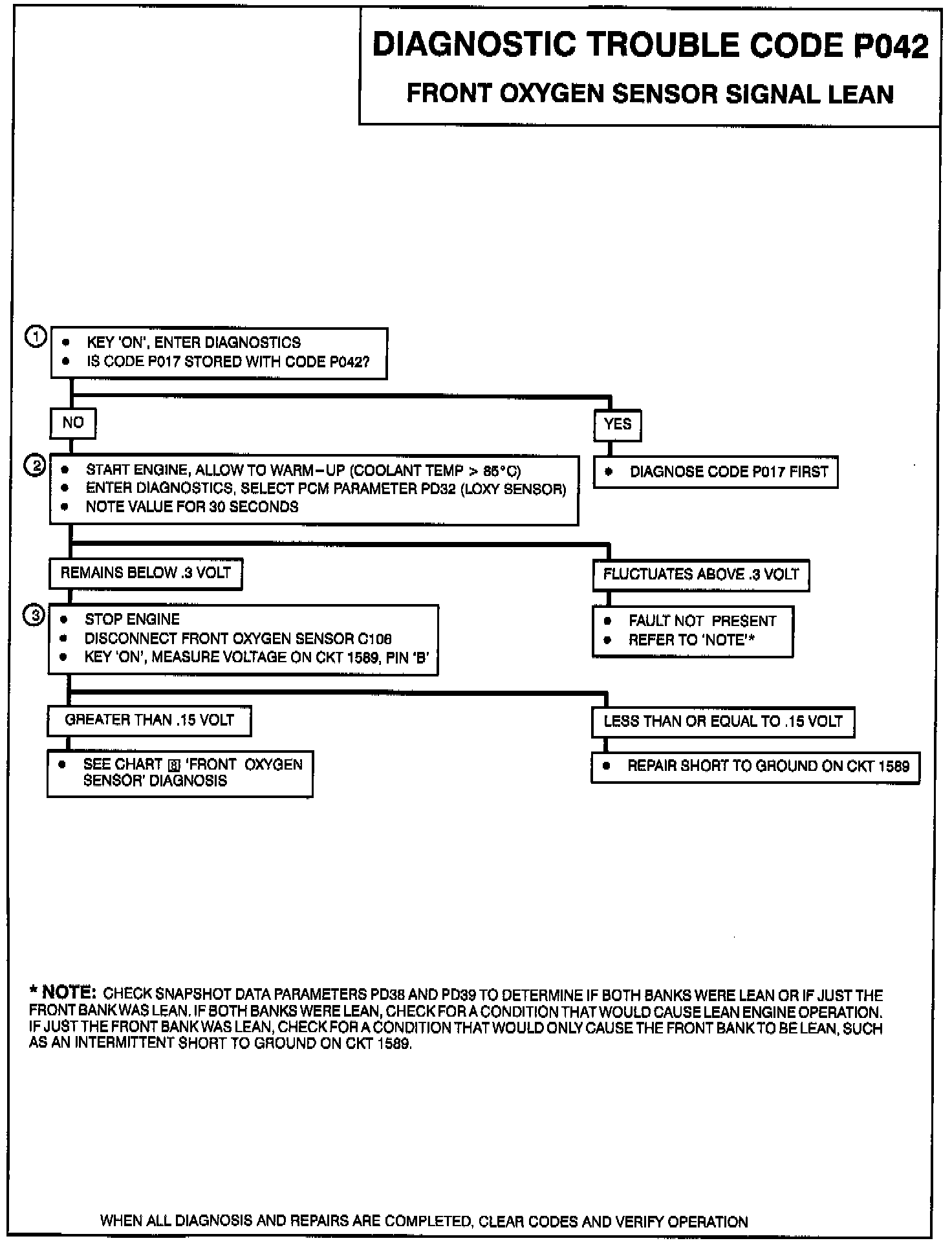 The PCM provides a 0.45 volt reference signal to the oxygen sensor on CKT 1589. When the oxygen sensor is cold (below 200°C), the oxygen sensor signal voltage will be around 0.45 volts and the PCM will keep the system in 'Open Loop' operation. When the oxygen sensor is warm (above 200°C), the oxygen sensor will swing from rich to lean rapidly, at least one swing every two seconds, if the PCM is in good control of the air fuel mixture. Code P042 is designed so that if the oxygen sensor stays at a lean voltage for more than 50.3 seconds during the test conditions, Code P042 will set. Code P042 will set when: