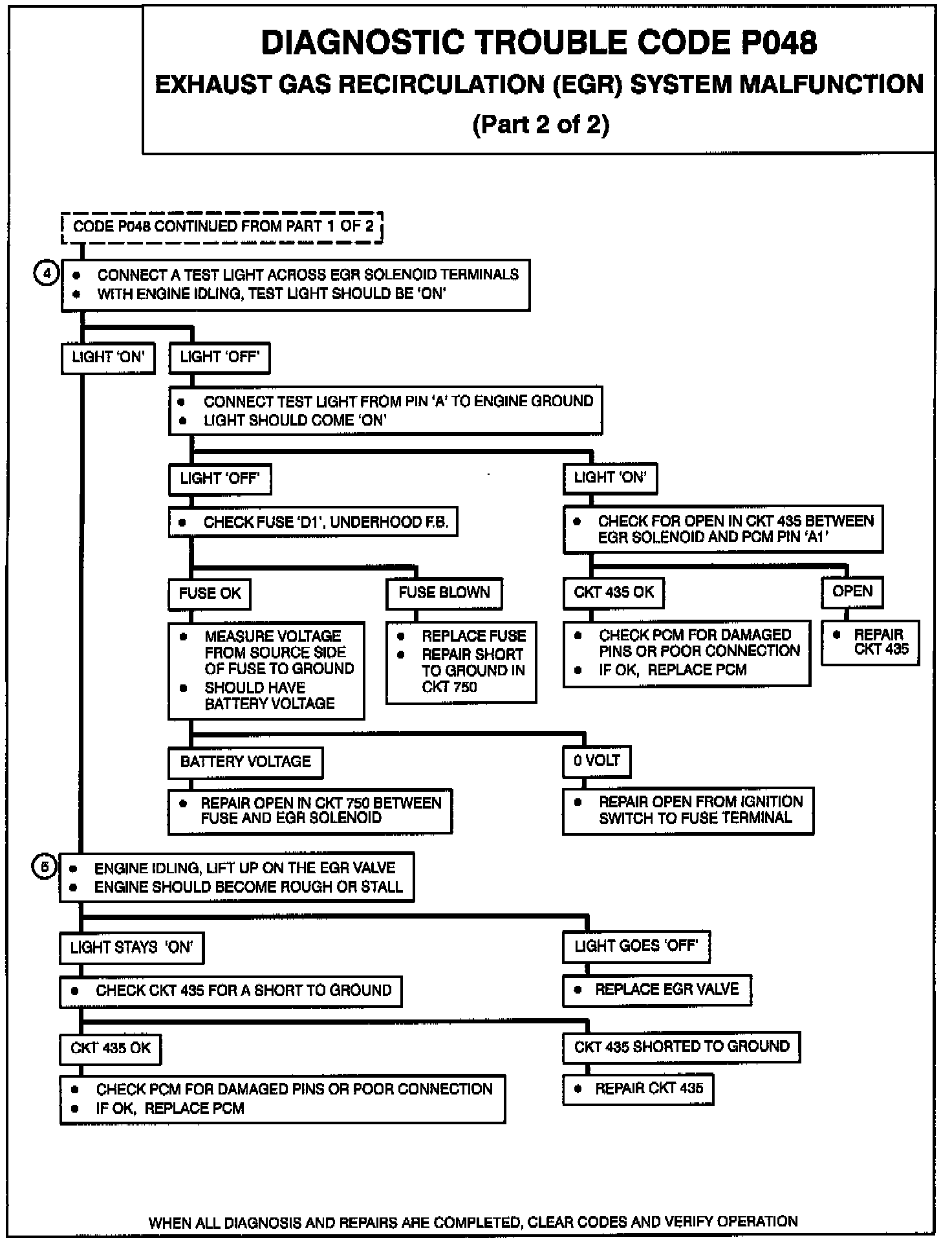 This diagnostic test is designed to check for an EGR system fault. After the engine is fully warmed up and the EGR system has been operating on full for a period of time, the PCM will disable the EGR valve and monitor the change in rear fuel integrator for the next 5 seconds. If the change is 14 counts or greater, the EGR system is functioning normally and will not be retested for the current ignition cycle. If the change is less than 14 counts, the test is failed and the counter is incremented. When the counter reaches 3, Code P048 is set. If at any time before the counter reaches 3 a change in the rear fuel integrator is 14 counts or greater the counter is decremented. If the counter reaches 0, the next rear fuel integrator change of 14 counts or greater will pass the test for the entire Ignition cycle. When Code PO48 is set, either the EGR system was turned off before the test started or the EGR system is functioning and the PCM does not have the ability to turn it off.