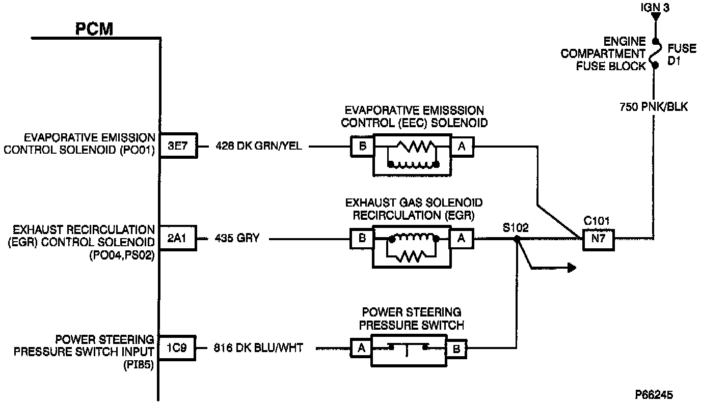 At idle, manipulate the EGR solenoid connector and PCM connector and related wiring. The EGR solenoid should remain energized (CKT 435 grounded) to block vacuum to the EGR valve/vent vacuum to atmosphere. Listen for a change in idle quality.