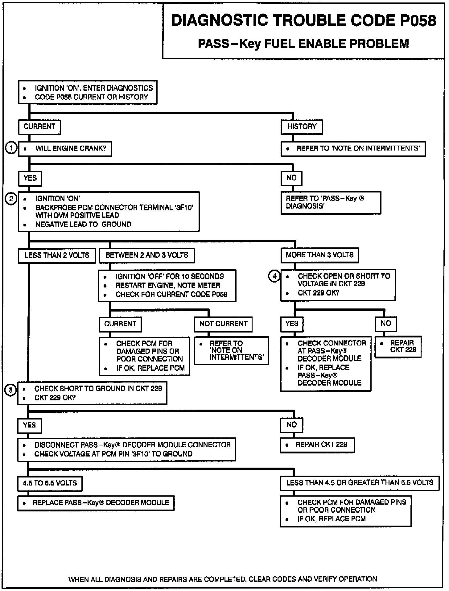3. Intermittent loss of power or ground to the PASS-Key Decoder module. The PASS-Key Decoder Module reads the ignition key once each ignition cycle when the ignition is first turned 'ON', therefore, faults in the key pellet and circuits to the ignition lock cylinder can cause a no start condition but cannot cause a stall or Code P058.