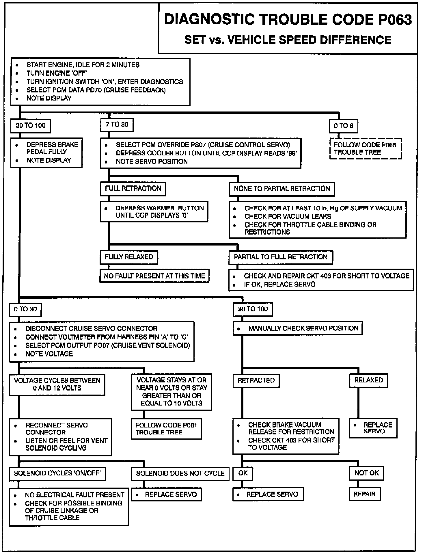 Code P063 will set and disengage the cruise control if vehicle speed is 20 mph higher than the set speed. This code is used as a type of safety valve to the cruise control system and can be set under normal conditions if the operator accelerates using the gas pedal and goes 20 mph higher than the cruise set speed.