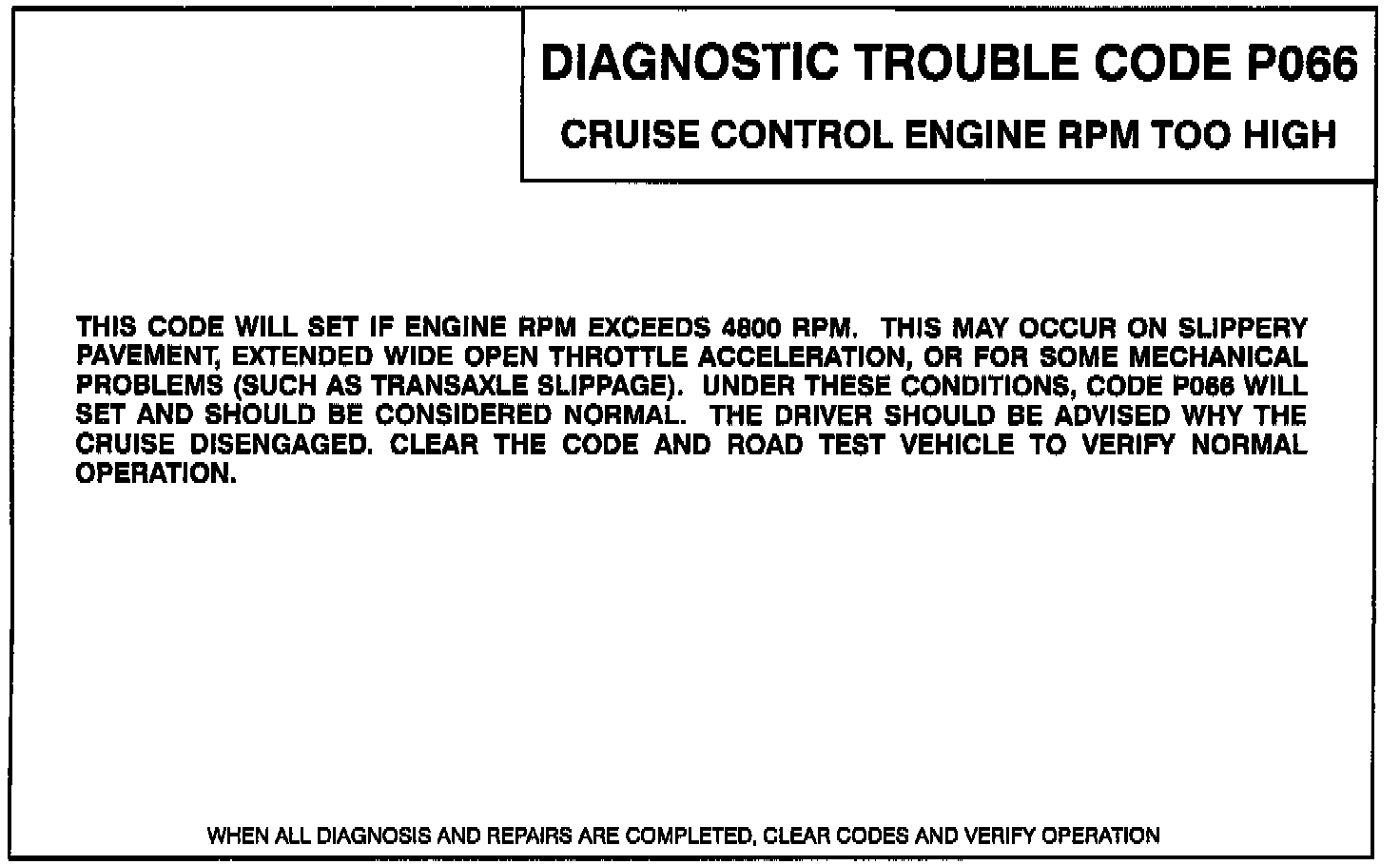 This code will set if engine speed exceeds 4800 rpm. This may occur on slippery pavement, extended wide open throttle acceleration; or for some mechanical problems (such as transaxle slippage). Under these conditions, Code P066 will set and should be considered normal. The driver should be advised why the cruise disengaged. Clear the code and road test vehicle to verify normal operation.