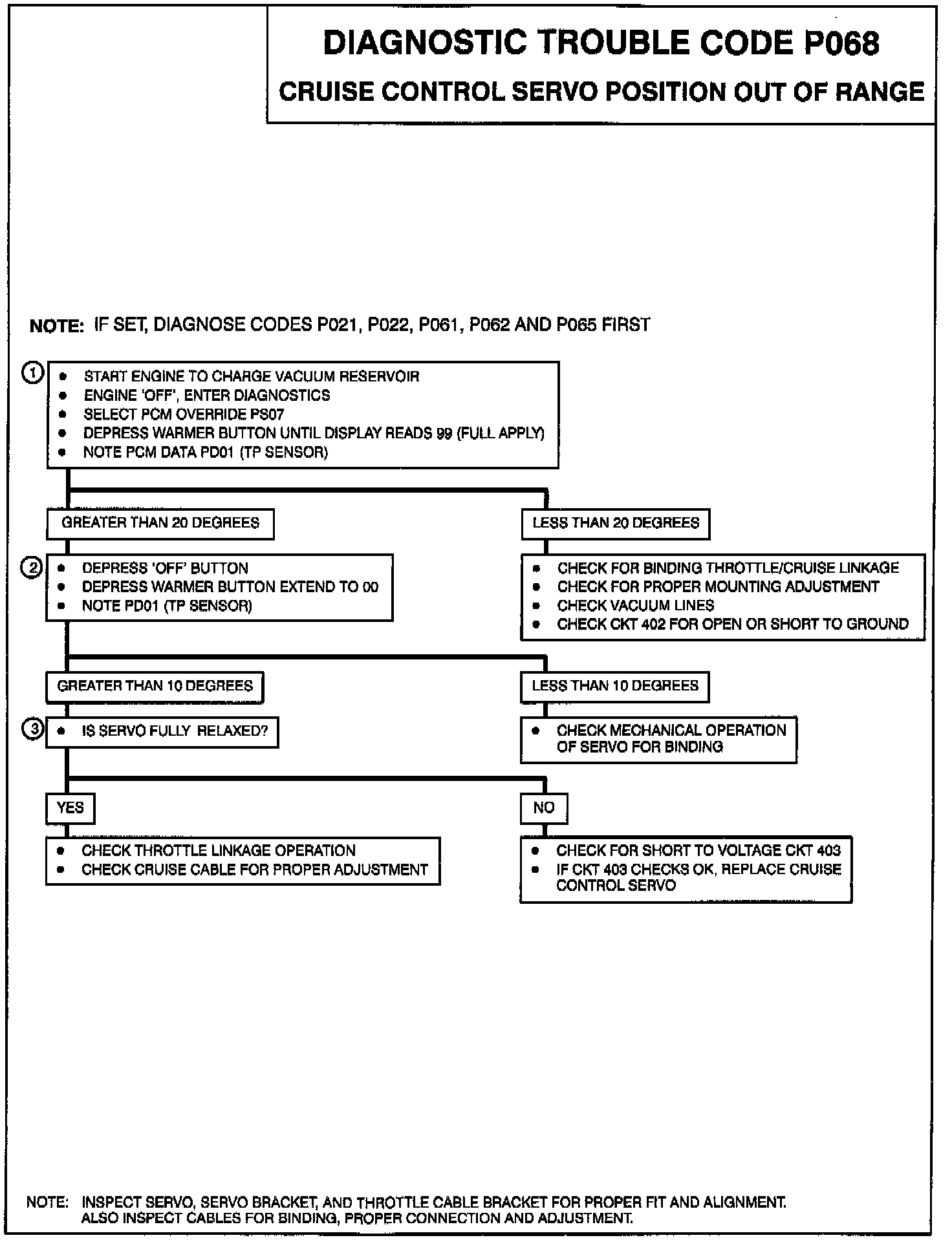 This diagnostic test checks for a cruise control servo feedback reading significantly higher or lower than the commanded value for a period of time. If such a condition occurs, Code P068 is set and cruise control is disabled.