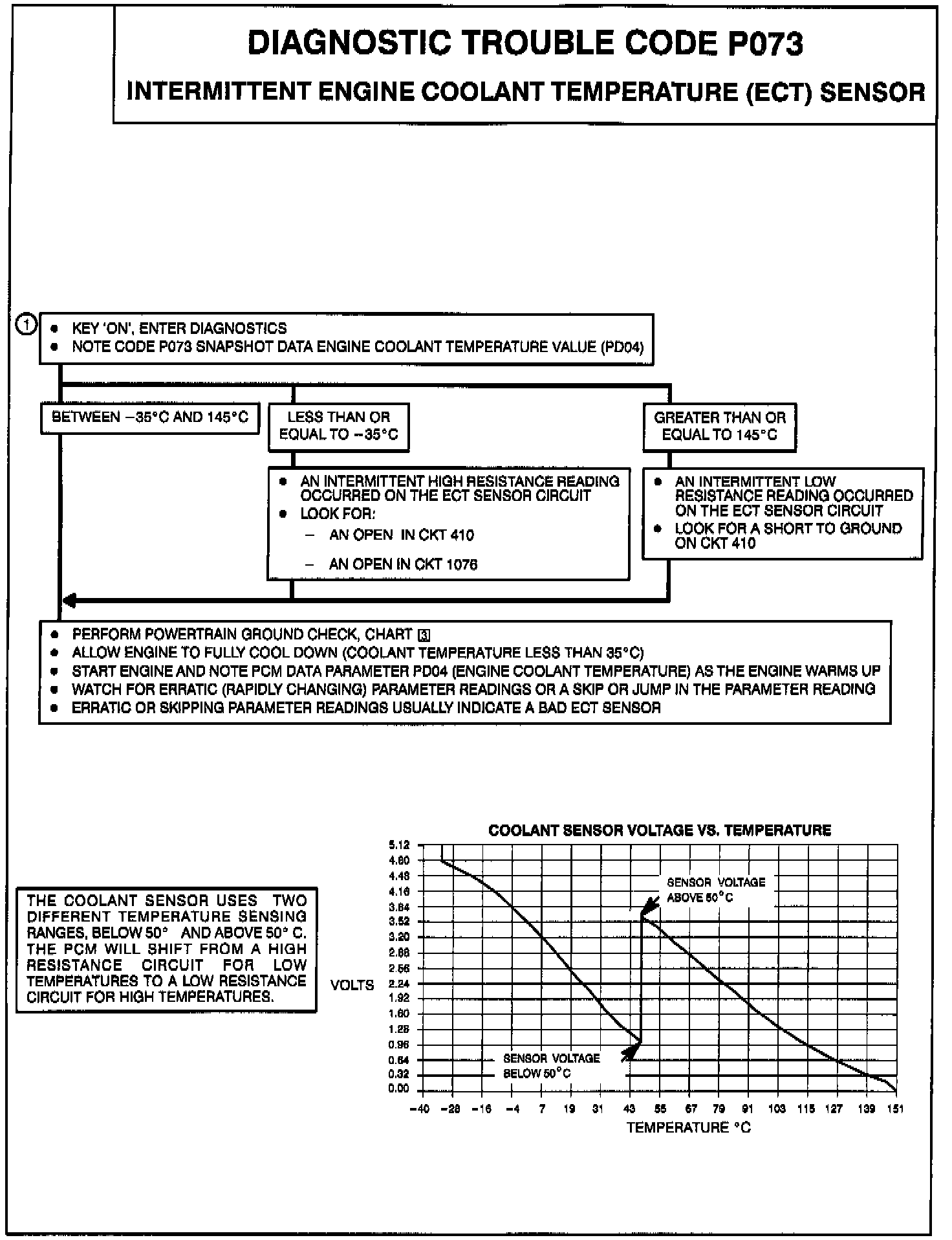 1. Checking Code P073 snapshot value is used to determine if an intermittent high resistance or an intermittent low resistance caused the code to set. An intermittent high resistance can be caused by an open in CKT 410 or CKT 1076. An intermittent low resistance can be caused by a short to ground on CKT 410.