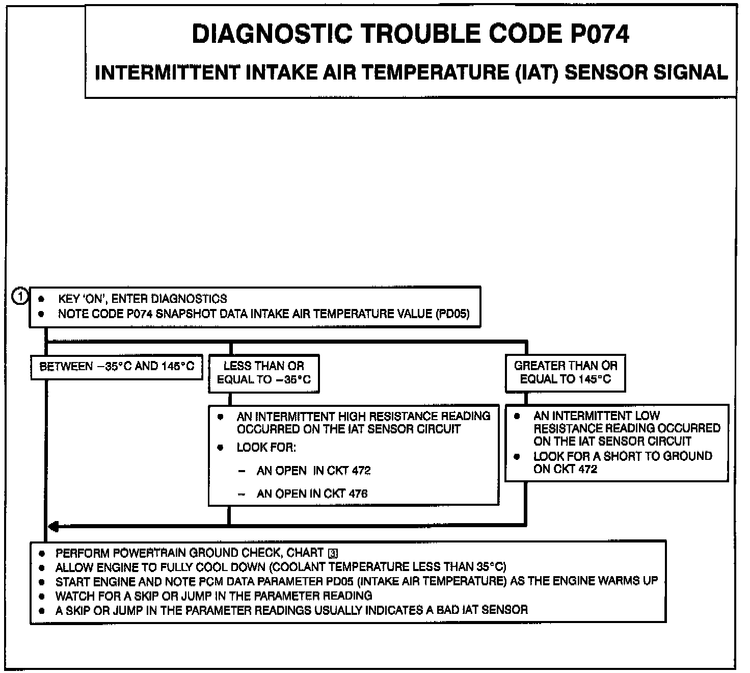 This diagnostic test monitors Intake Air Temperature (IAT) sensor voltage. If the PCM detects a large change in sensor output voltage in a 0.25 second period of time, Code P074 will set.