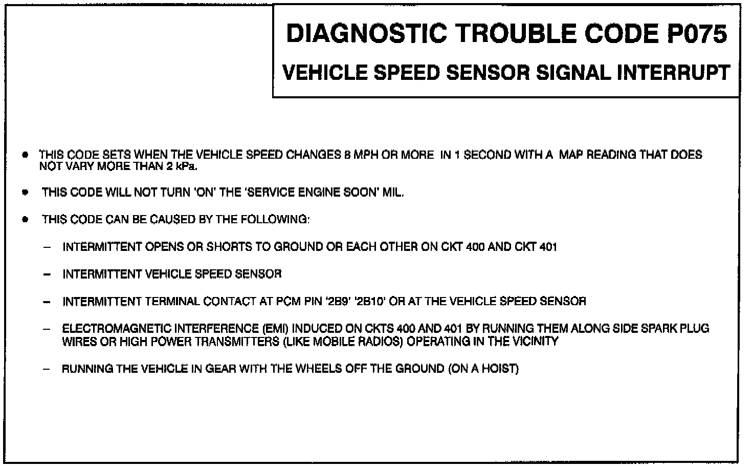 This diagnostic test compares the vehicle speed to Manifold Absolute Pressure (MAP). There must be a corresponding change in MAP with a change in vehicle speed. The PCM will ignore the test if conditions for engine idle are present. If the vehicle speed changes 8 mph or greater in 1 second and is not accompanied by a greater than 2 kPa change in MAP Code P075 will set.