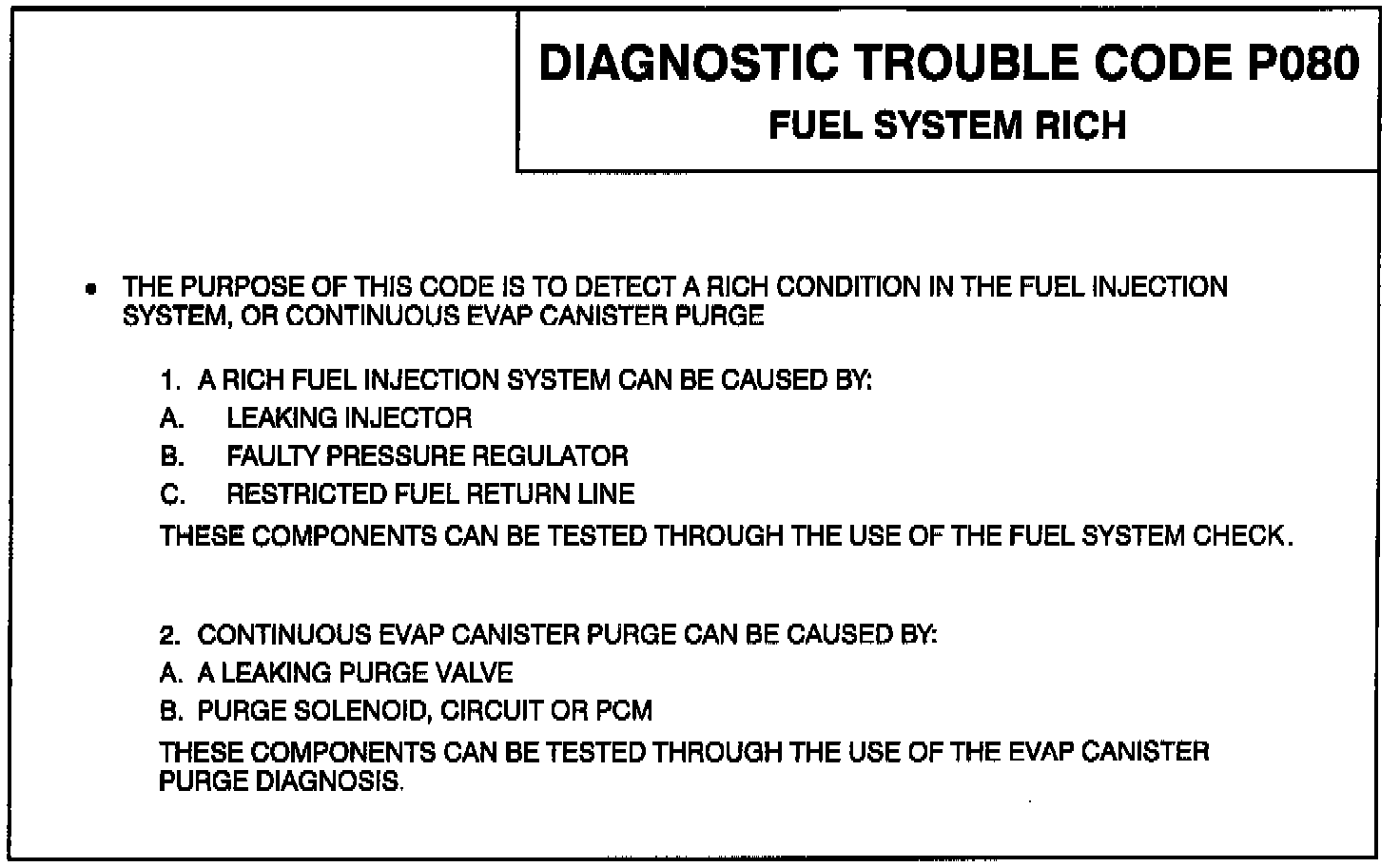 When all of the above test conditions have been met and long term fuel trim is 104 or less, the system turns off canister purge to attempt to make the system become less rich. If long term fuel trim is still 104 or less (rich system), the Code P080 is set.