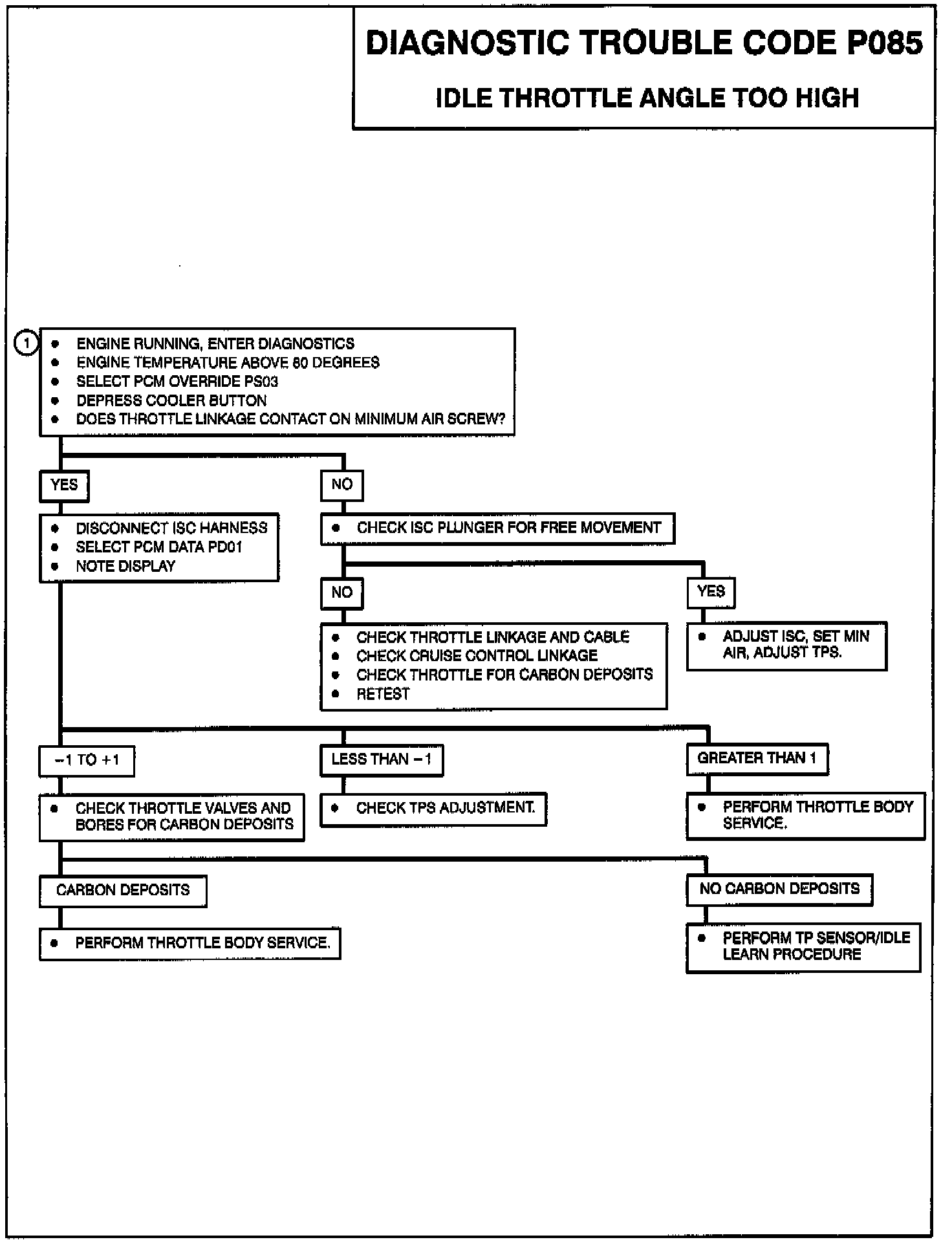 The PCM continuously learns base idle position. This base idle position is the relationship of engine RPM to throttle position. The PCM is limited to a fixed amount of learned throttle angle that it can apply. When this limit is reached, Code P085 will set. The cause of this increase in learned throttle angle is usually deposits in the throttle body.
