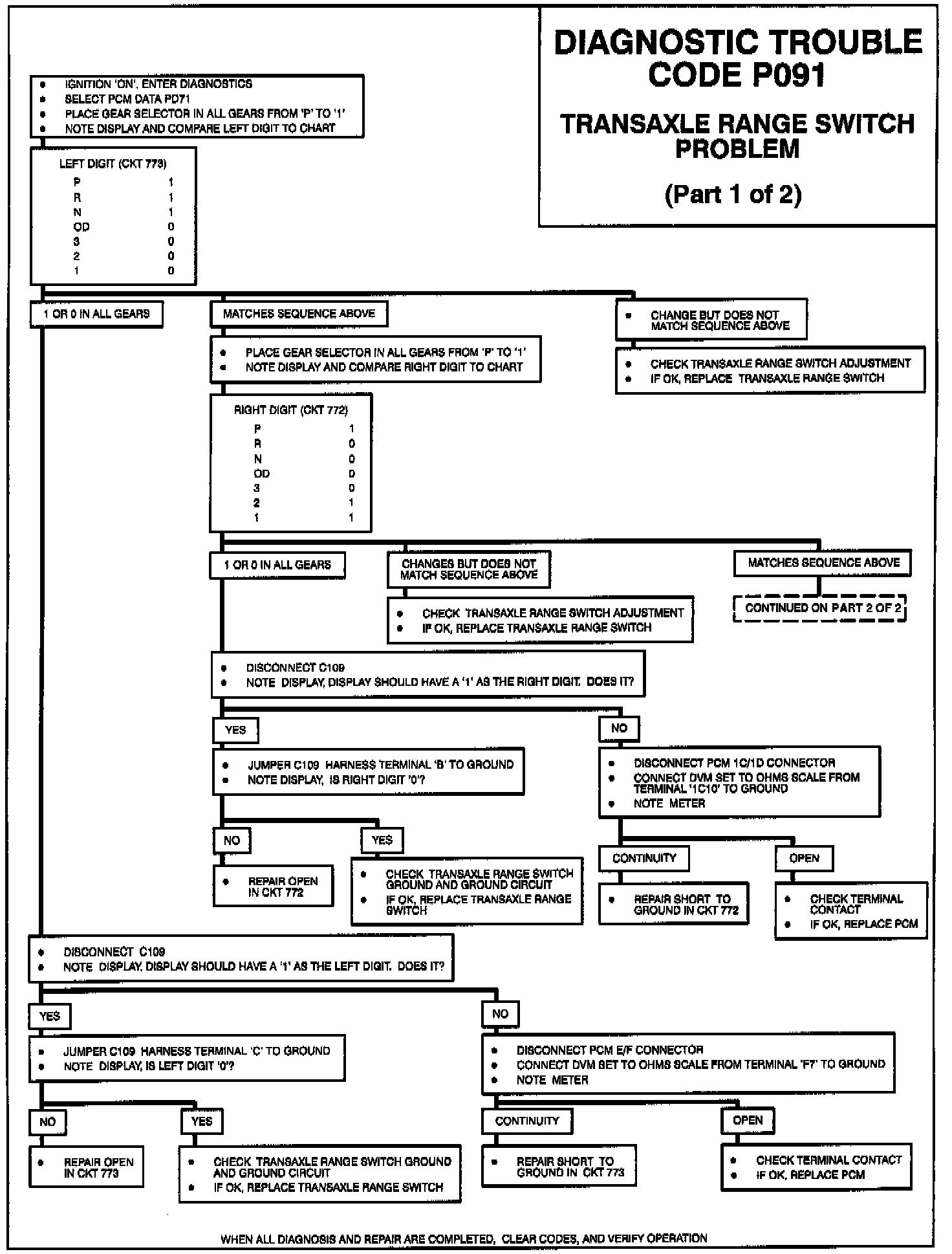 On the other hand, if the code occurs and the Service Engine Soon vehicle comes on while driving or when the driver is not moving the gear selector lever, record PD71 and PD72 and compare the values to the chart. For example, if the driver was driving in 'OD' when the message came on and PD71 reads 10 and PD72 reads 11, check for an intermittent open in CKT 773. Manipulate related wiring and connectors while observing parameters PD71 and PD72 (or scan tool display). If an intermittent is induced, the digit corresponding to that circuit will change. If wiring and connectors check out OK, substitute a known good Transaxle range switch and recheck.