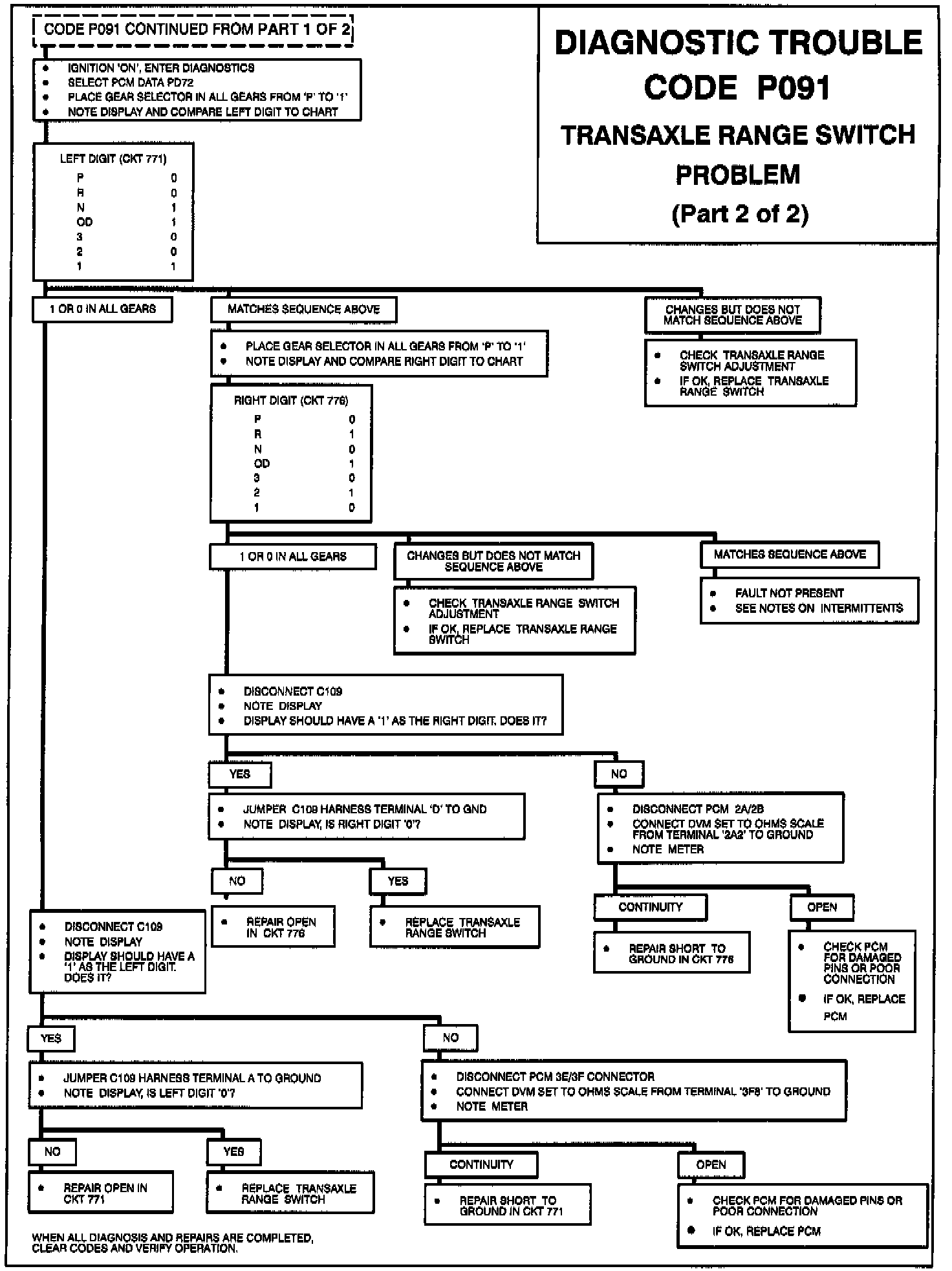 The PCM code snapshot provides valuable information in diagnosing an intermittent Code P091. If all digits of PD71 and PD72 are 1, then check for an intermittent loss of ground to the transaxle range switch. If an intermittent Code P091 occurs when the transaxle shift lever is moved, the code is most likely caused by a misadjustment of the shift linkage or Transaxle range switch, causing the Transaxle range switch to end up in the range between gears.