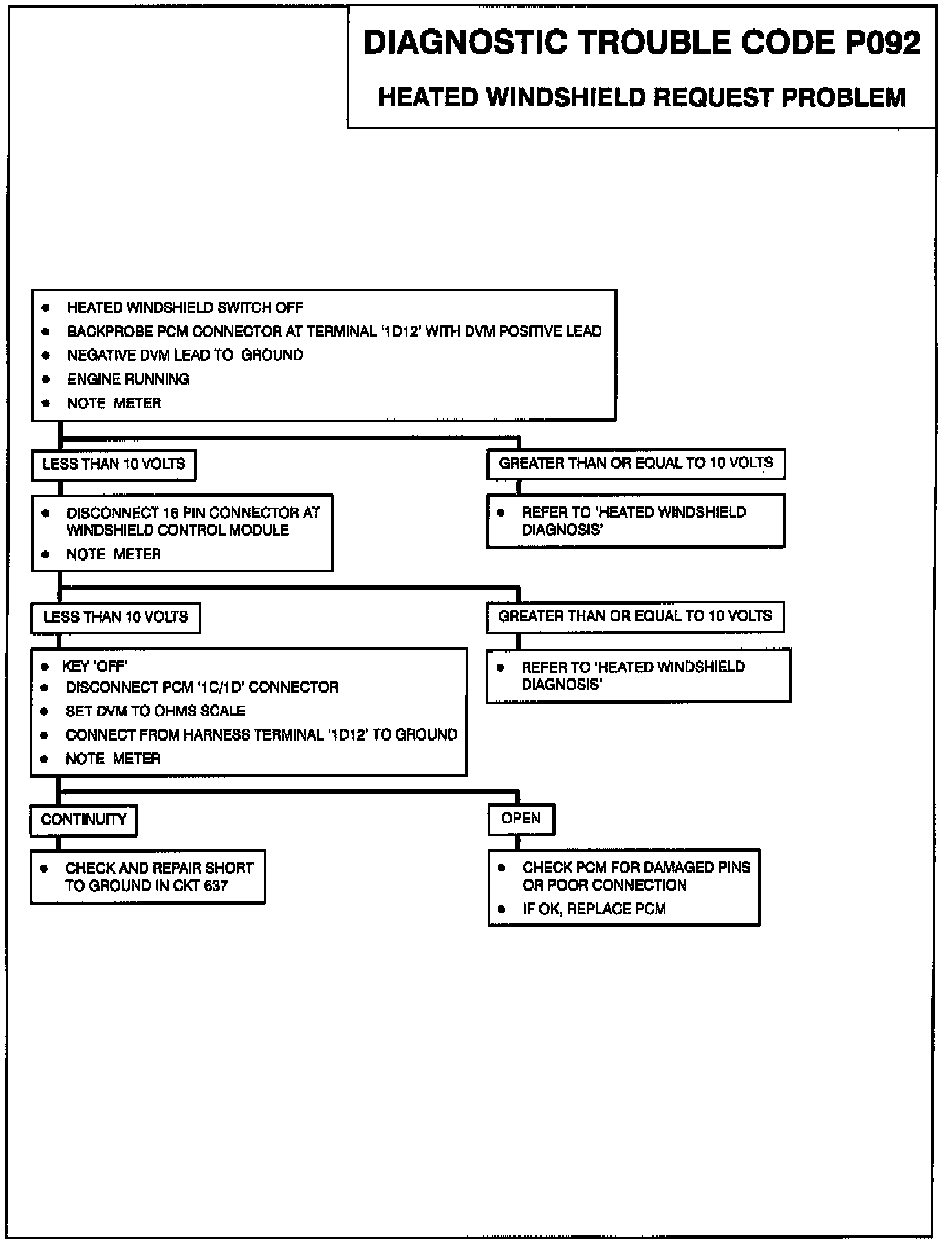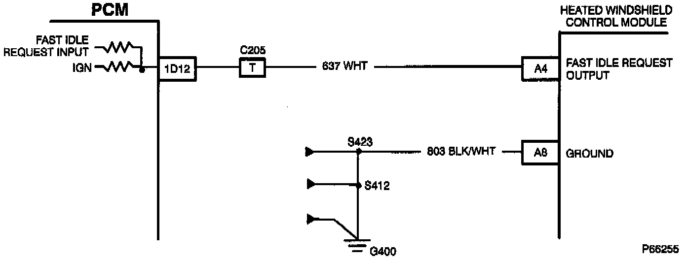 The purpose of this diagnostic test is to detect a problem with the Heated Windshield fast idle request circuit to the PCM. When the circuit is grounded by the Heated Windshield module, the PCM will increase idle speed to compensate for the electrical load placed on the generator. If the signal is low for more than 10 minutes, Code P092 will set.