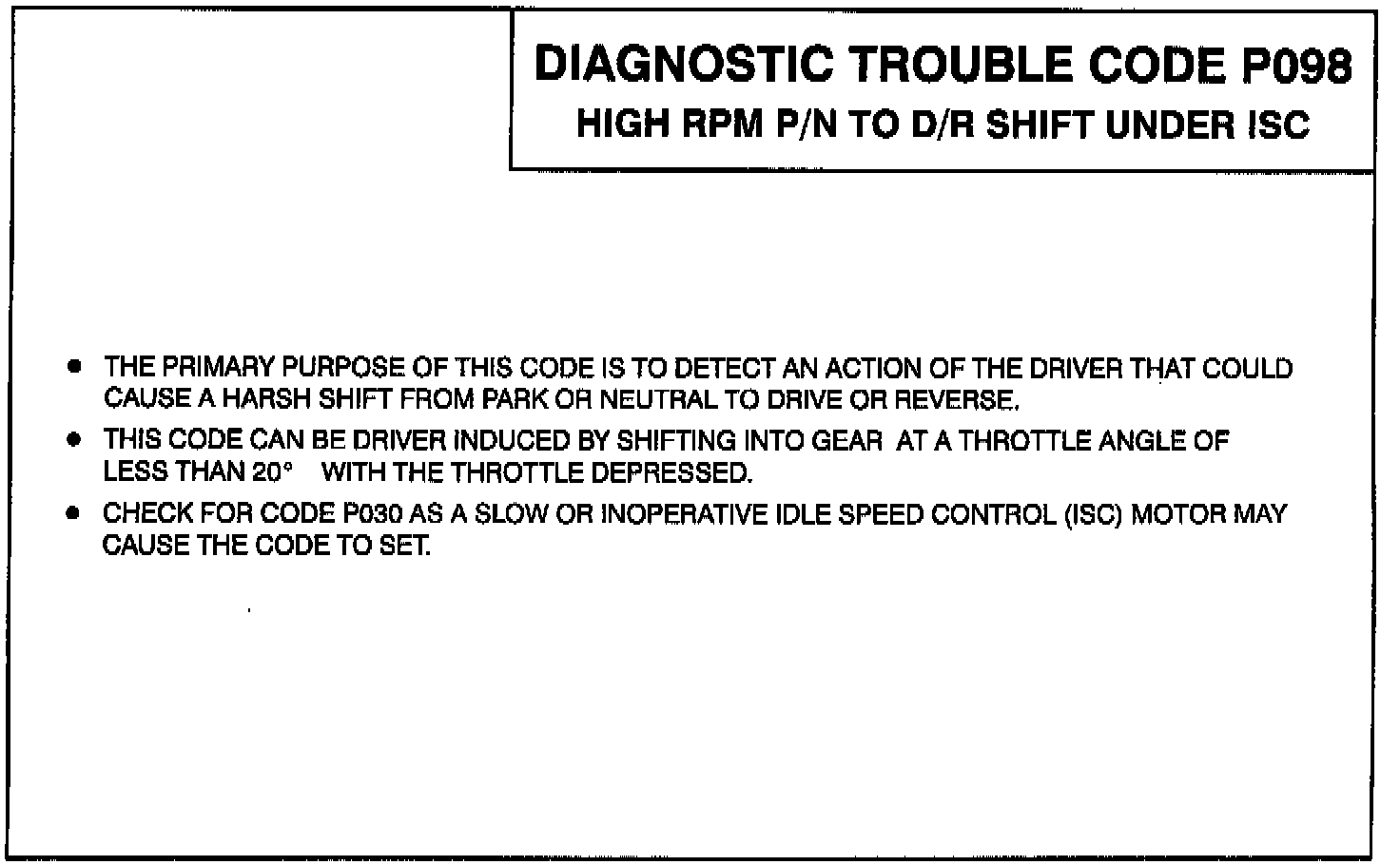 This diagnostic test monitors idle speed and gear selection from Park or Neutral to Drive or Reverse when the throttle is in ISC speed range. If idle speed is greater than desired, the PCM will retard the spark to reduce engine power and set Code P098.