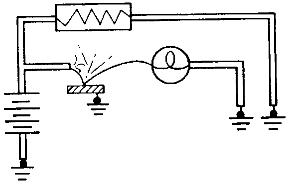 A grounded circuit is like a short circuit but the current flows directly into a ground circuit that is not part of the original circuit. This may be caused by a wire rubbing against the frame or body. Sometimes a wire will break and fall against metal that ia connectod electrically to the ground side of the voltage supply. A grounded circuit may also be caused by deposits of oil, dirt, or moisture around connections or terminals, which provide a good path to ground.