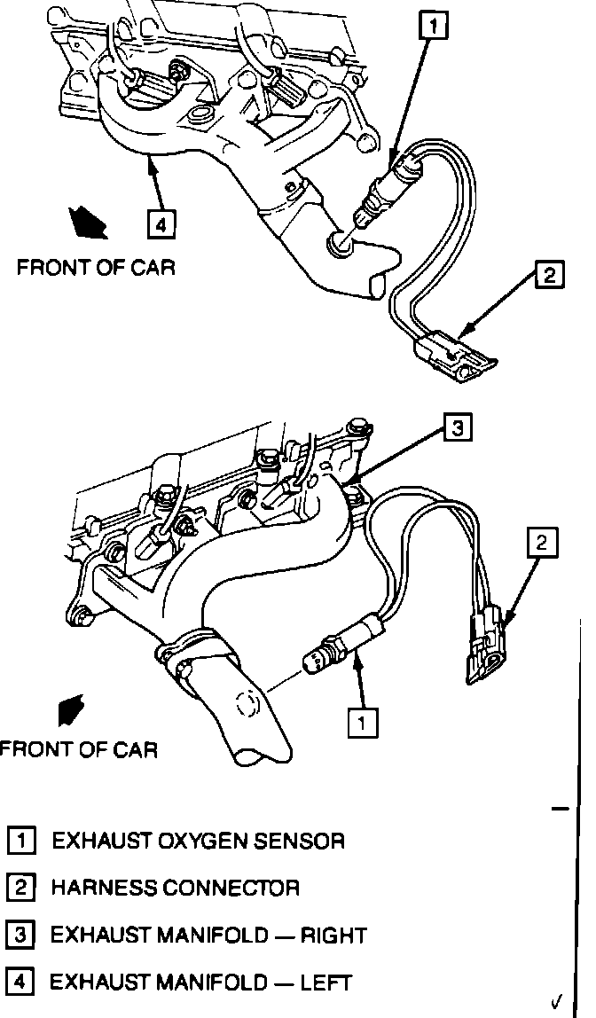 2. Using suitable wrench, carefully remove sensor from exhaust manifold or pipe. The oxygen sensor may be difficult to remove when engine temperature is below 120°F. Use caution, since excessive force may damage threads in exhaust manifold or pipe.