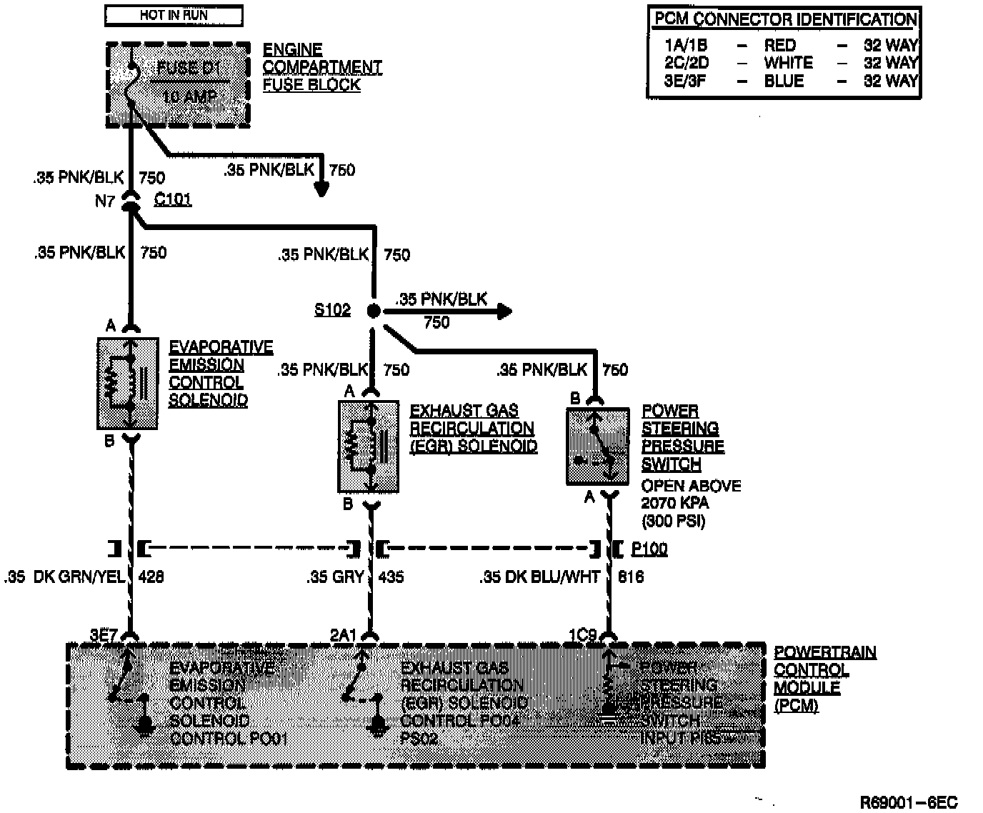 The EVAP solenoid receives 12 volts from fuse 'D1' in the engine compartment fuse block through CKT 750. The PCM energizes the EVAP solenoid by grounding pin '3E7' (CKT 428). When the solenoid is energized it allows the EVAP canister to purge.