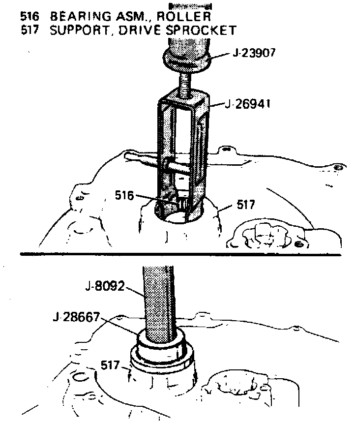 7. Inspect drive sprocket support bearing and replace, if necessary, as shown. Install new roller bearing assembly with identification mark facing up.