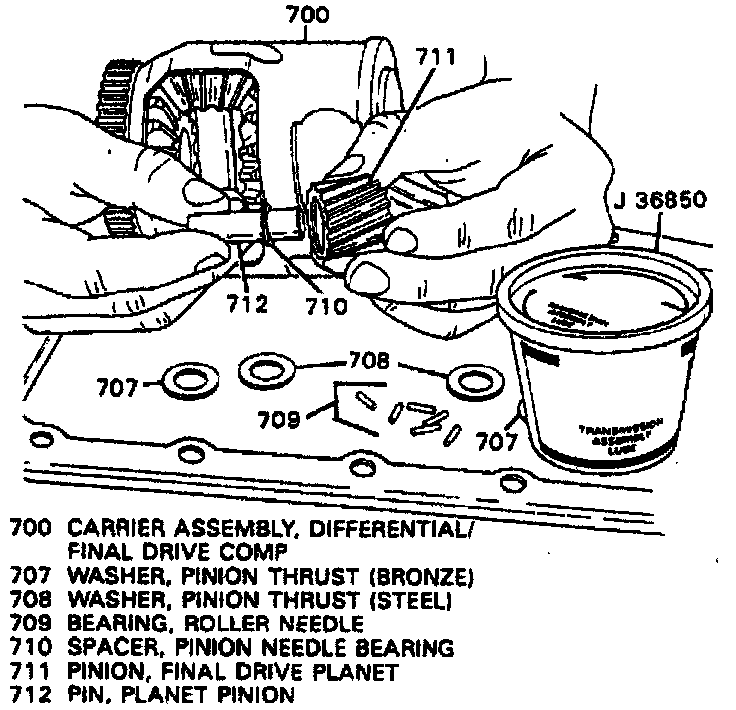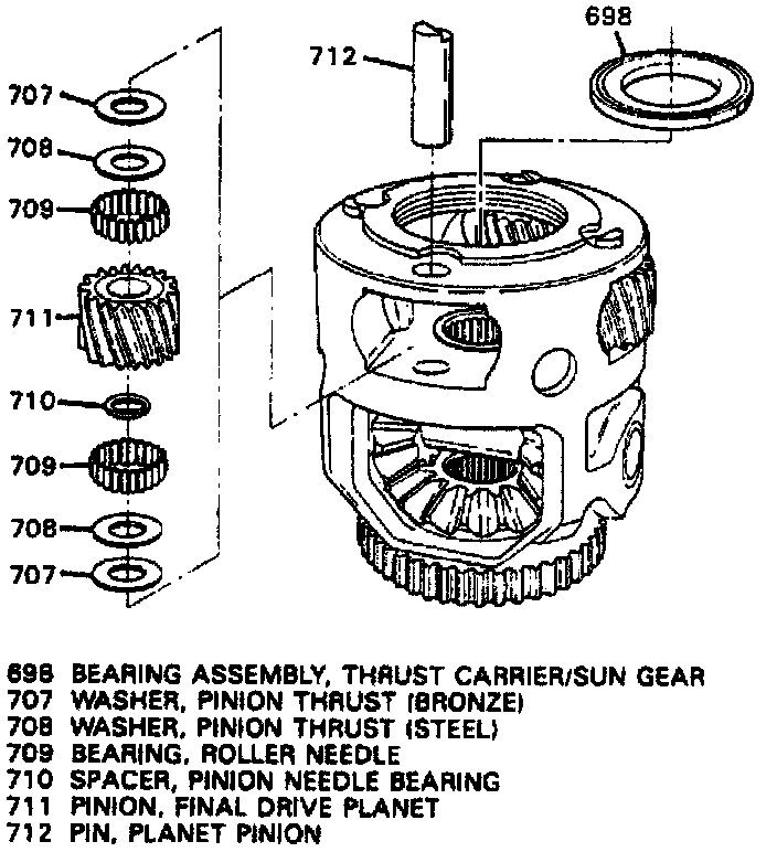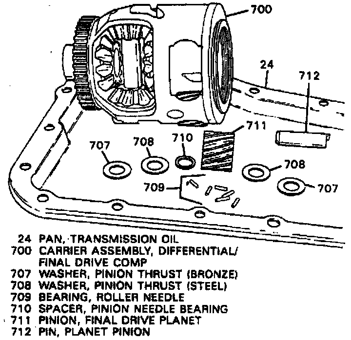 d. Inspect washers, needle bearings and pinion shaft for wear. Discard bronze washer (707) and replace with steel washer (708).