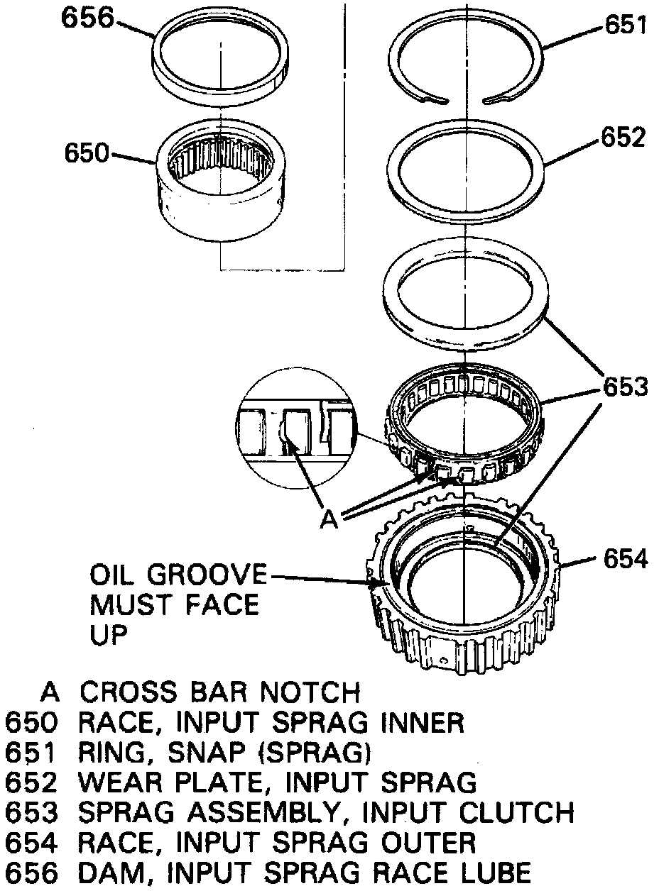 51. Place one wear plate against snap ring, then the sprag assembly against wear plate with cross bar notches positioned as shown.