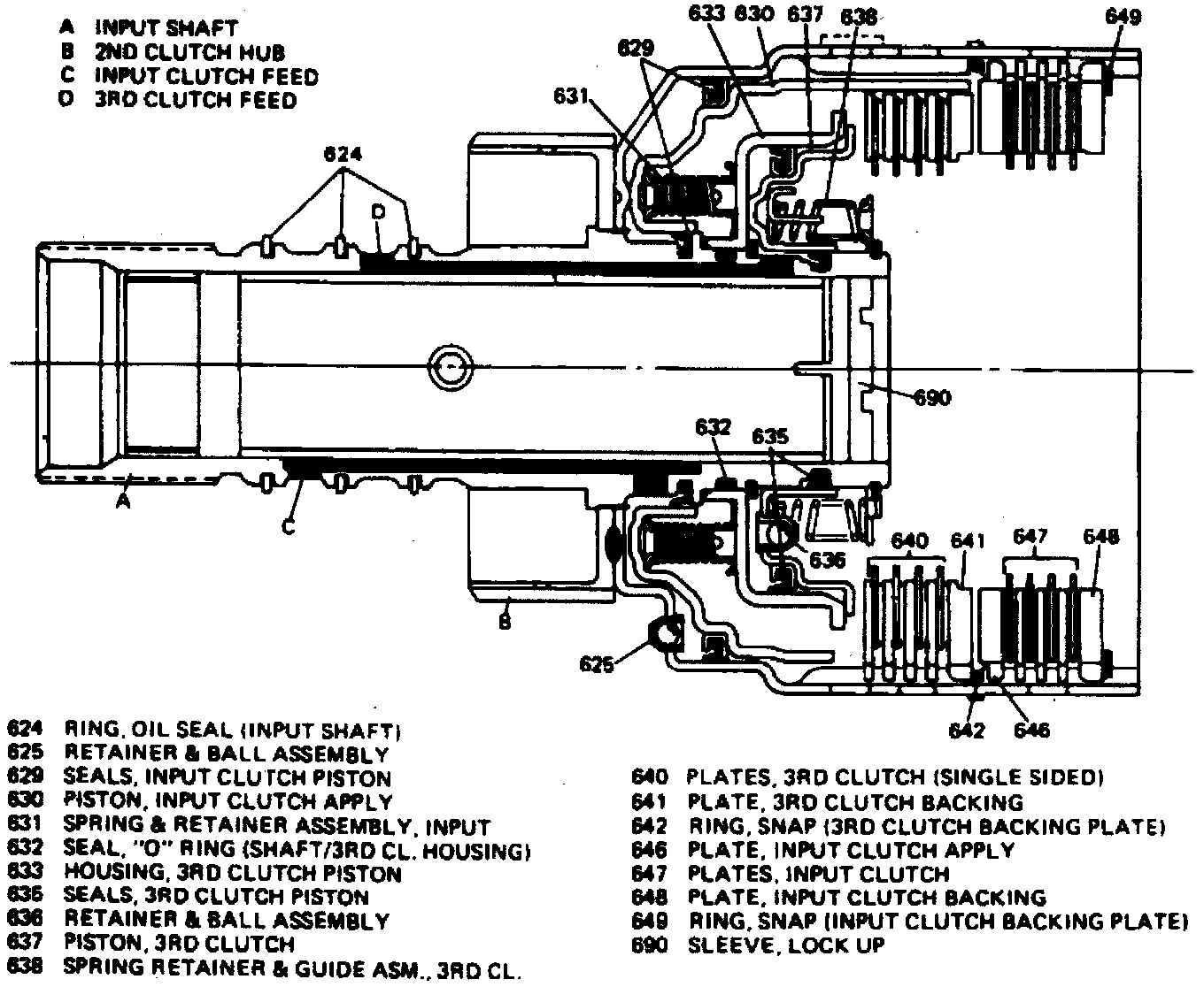 89. Ensure proper operation of input clutch assembly by applying approximately 90 psi of air pressure to air passages marked C and D and check for proper clutch apply.