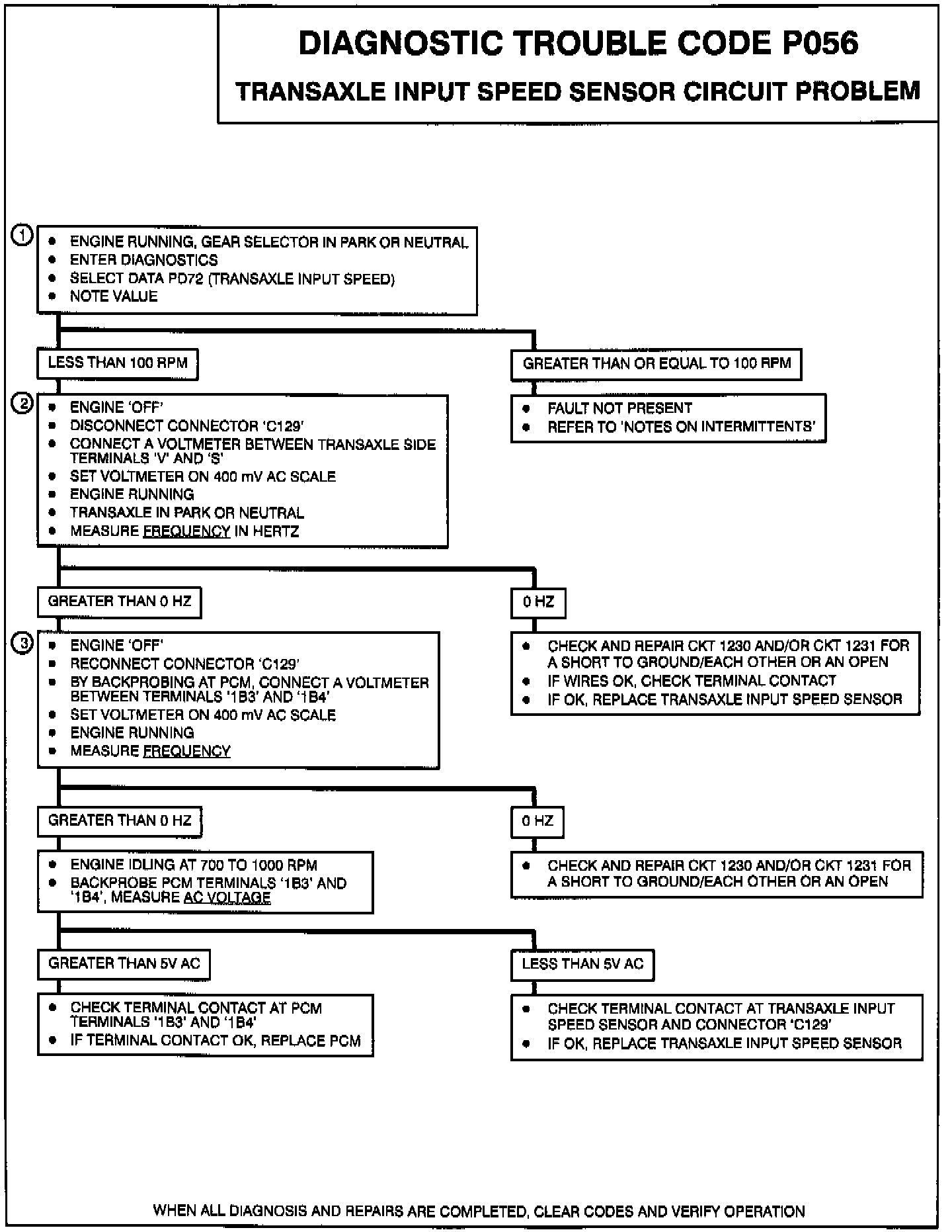 2. The transaxle input speed sensor will generate a frequency of greater than 0 Hz when the vehicle is idling. If it does not check CKT 1230, CKT 1231 and speed sensor for open/shorts inside the transaxle.