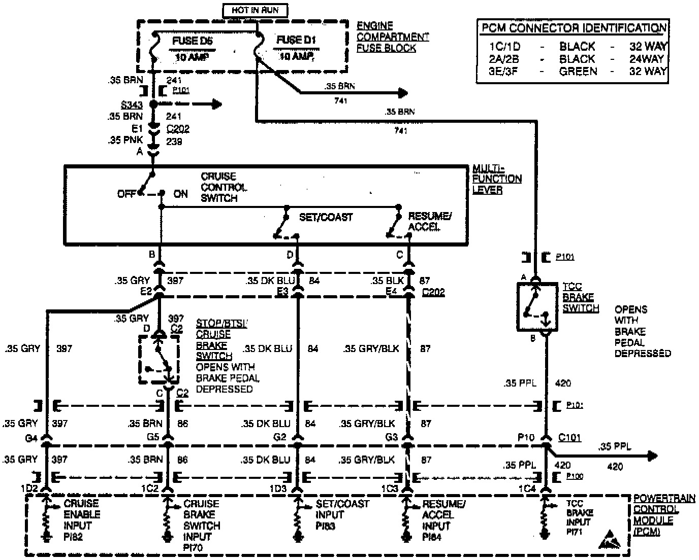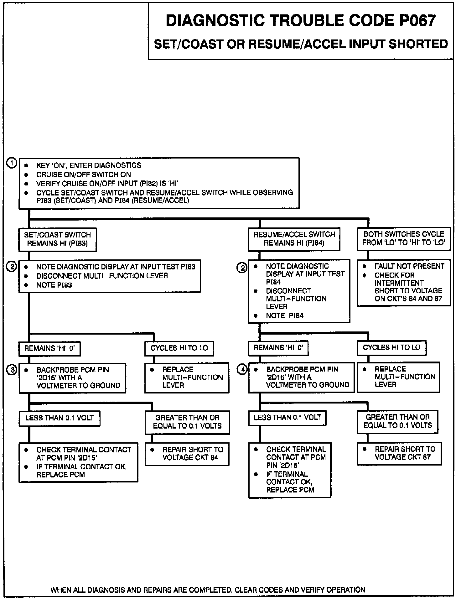 When the cruise control "ON/OFF" switch is "ON," system voltage is available at one side of the normally open contacts on the SET/COAST and RESUME/ACCEL switches at key "ON." If the SET/COAST or the RESUME/ACCEL switches were stuck or their signal wires to the Powertrain Control Module (PCM) were shorted to voltage, the vehicle could begin cruise operation. To prevent this, Code P067 will set and disable cruise control if signal voltage from the SET/COAST (CKT 84) or RESUME/ACCEL (CKT 87) is HI continuously for 10 minutes. Cruise control will be disabled until the PCM sees a LO on both of these signals.