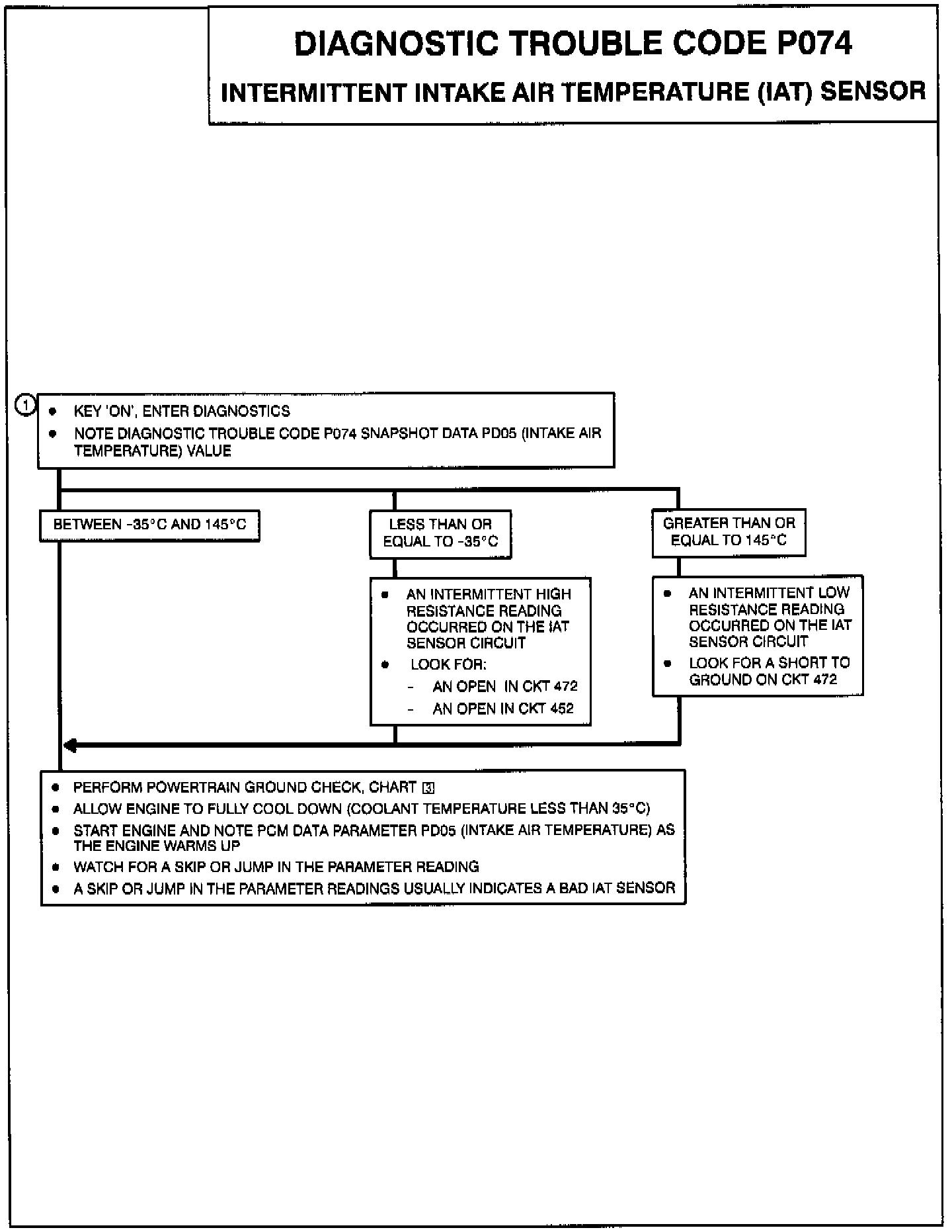This diagnostic test monitors Intake Air Temperature (IAT) sensor voltage. If the Powertrain Control Module (PCM) detects a large change in sensor output voltage in a 0.25 second period of time, Code P074 will set.