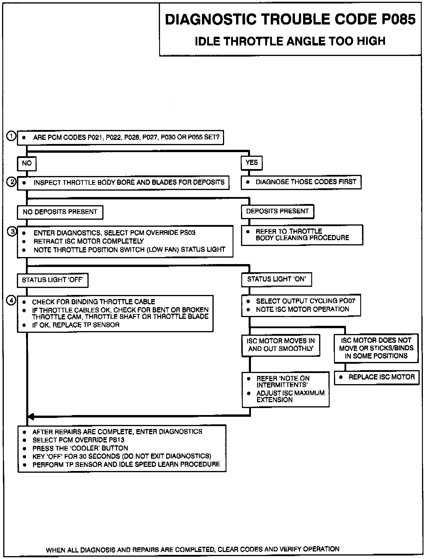 Code P085 may set due to an engine overheated condition in which the PCM will only allow the engine to run on four cylinders, causing a high idle throttle angle. If this occurs, clear Code P085, reset Idle Learn using PCM override PS13 and perform TP Sensor/Idle Learn.