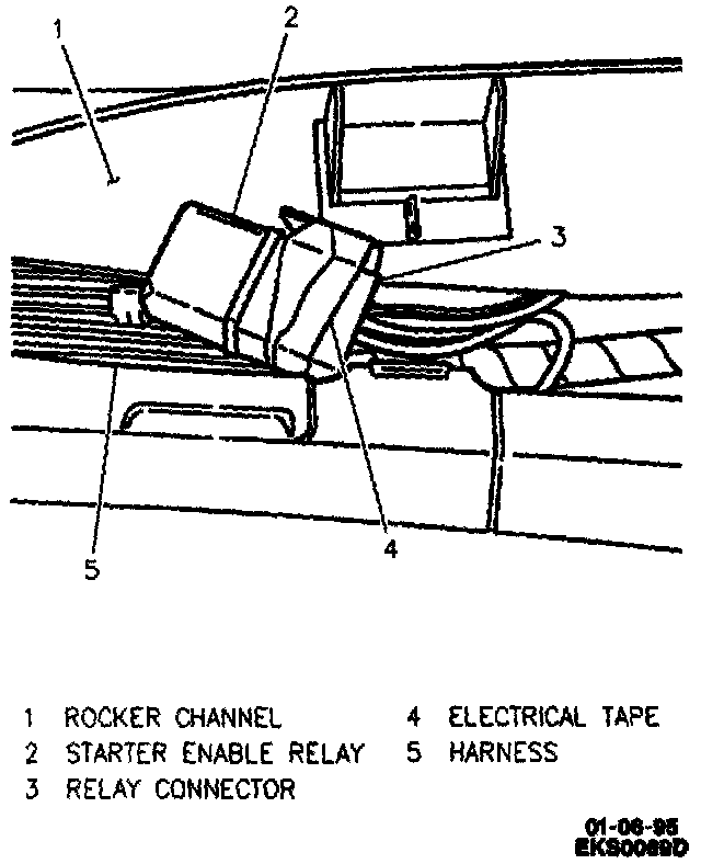 The Starter Enable is taped to body main harness, 9 inches rearward of front edge of LH rocker panel channel.