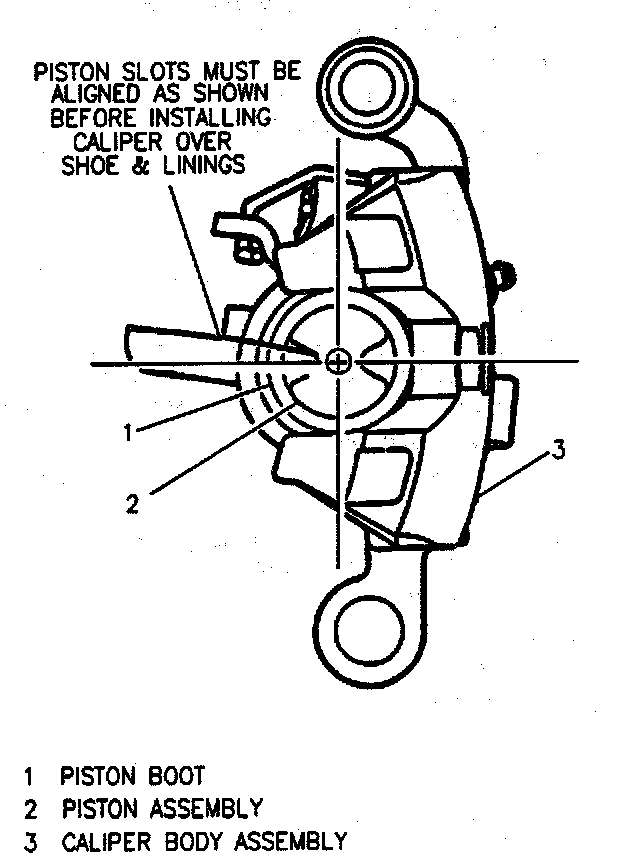 Important: After bottoming piston, lift inner edge of boot next to piston assembly and press out any trapped air. Boot must lay flat. Make sure slots in end of piston are positioned as shown in figure before pivoting caliper body assembly down over pad and linings in caliper support. Use suitable spanner type tool in piston slots to turn piston as necessary. Whenever installing new pad and linings, use new pad clips. These are provided in the disc pad kit.