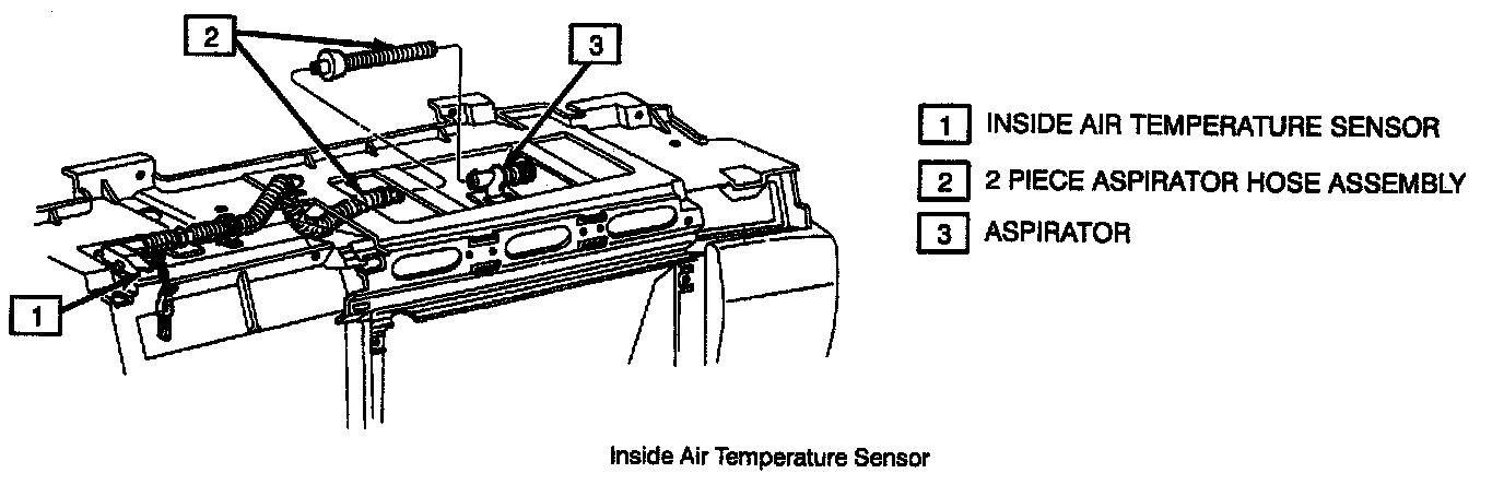 The inside air temperature sensor is located in the Instrument Panel (I/P) to the left of center. To provide interior air temperature sensing, a small amount of air is drawn into the sensor housing and passed over the thermistor. The air movement is accomplished by using an aspirator mounted on the top of the HVAC module. Air flow from the HVAC module creates a slight vacuum at one end of the aspirator which draws inside air through the sensor housing and over the thermistor.