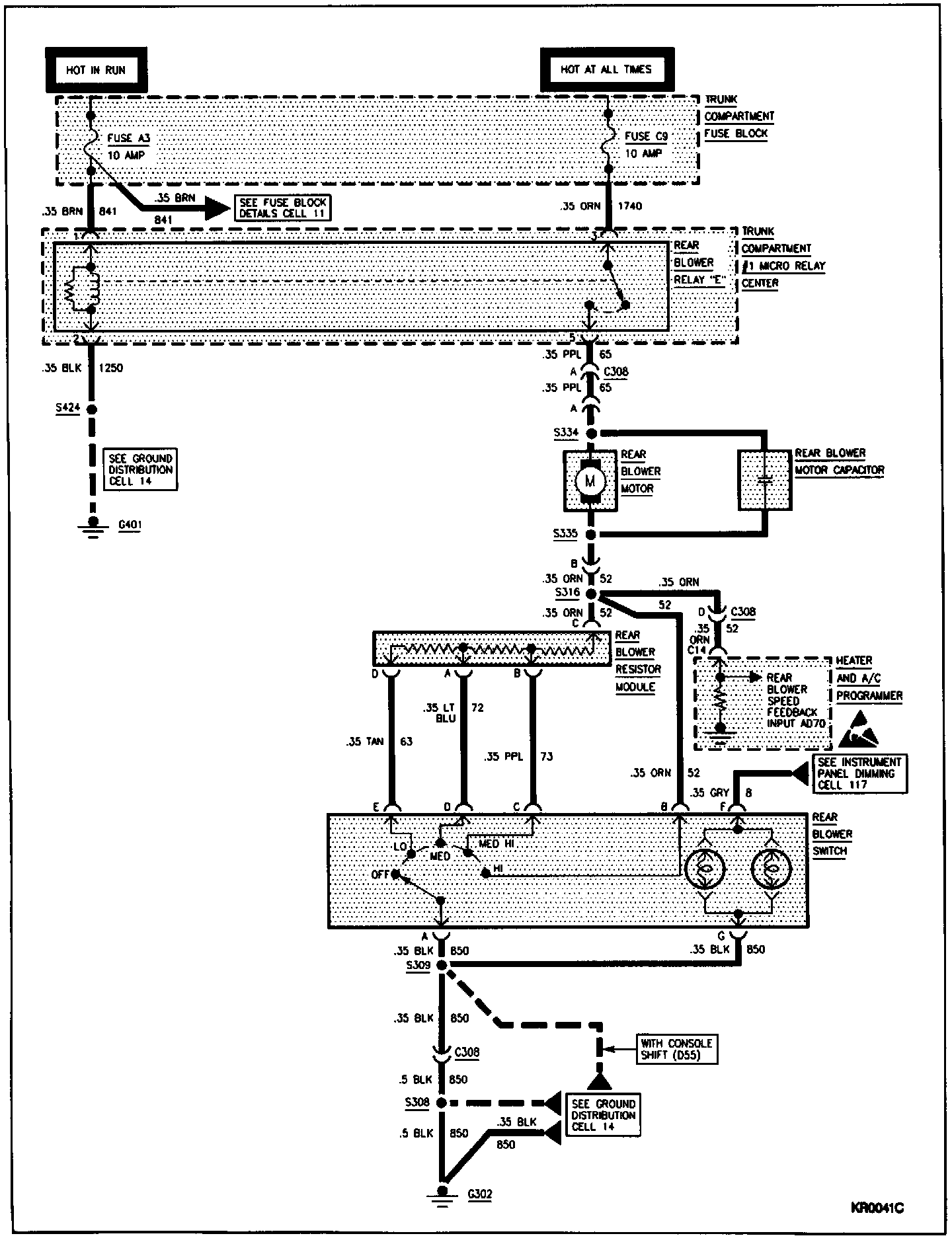 Power from the fuse is applied to the blower and ground is supplied through the switch. The blower speed is controlled by varying the circuit amperage using a series of three resistors contained in a module. The Air Conditioning Programmer (ACP) receives a feedback signal but has no bearing on the rear blower operation.