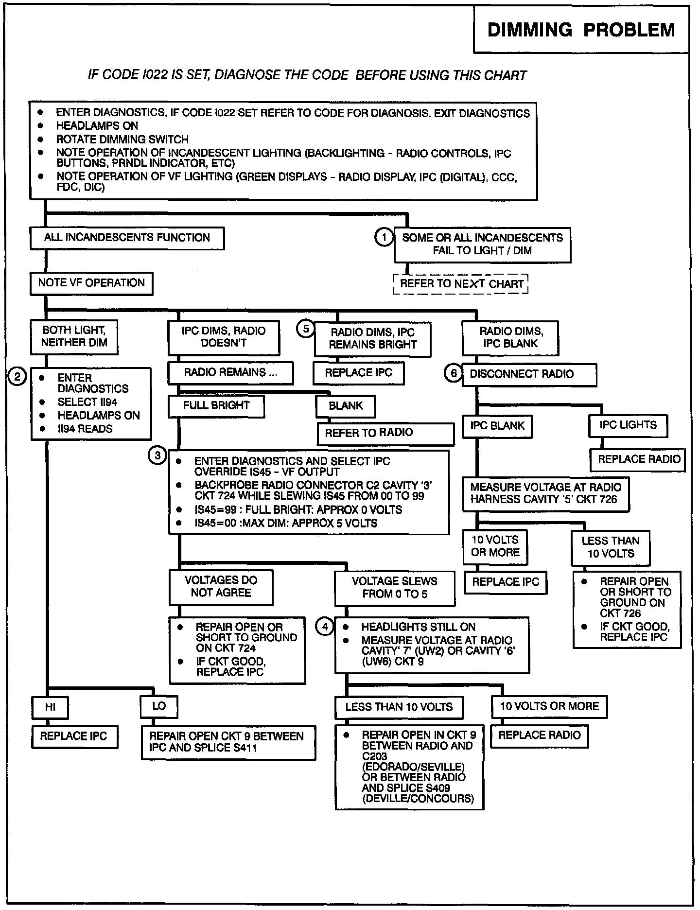 4. Since no incandescent lights work, the problem may be in CKT 8, headlamp switch, or power feed to the headlamp switch. However, Code I022 would set for all of these conditions except for an open CKT 9 to the IPC and the headlamp switch, therefore look for an open CKT 9 between splice S411 and fuse "D13."