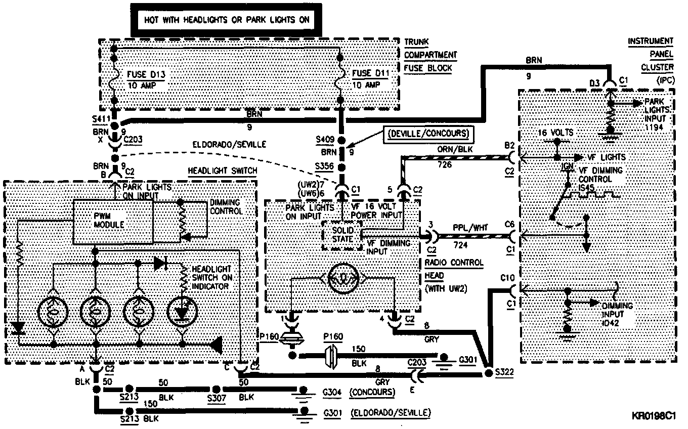 The IPC also controls the Radio Heads VF displays. The IPC feeds a constant 16 volt feed to the Radio to power its VF display. When dimming is required, the IPC sends a PWM signal (IS45) via CKT 724 to the radio to control the dimming of the VF display. The radio will only dim when it sees parklamps "ON" (voltage at pin "7," CKT 9).