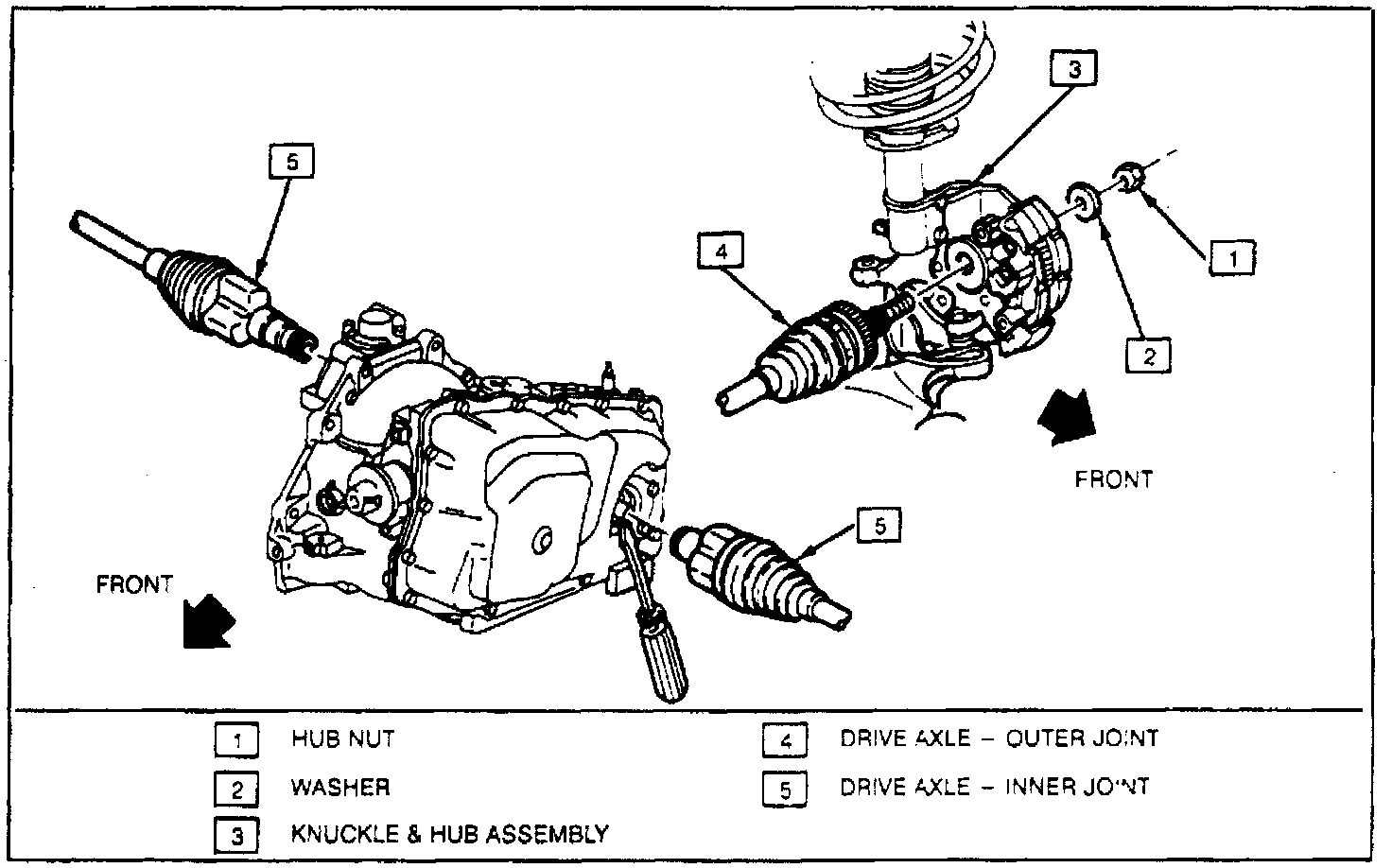 e. Remove drive axle from hub using suitable front hub spindle remover, then move strut and knuckle rearward. Remove drive axle from transaxle with suitable prybar.