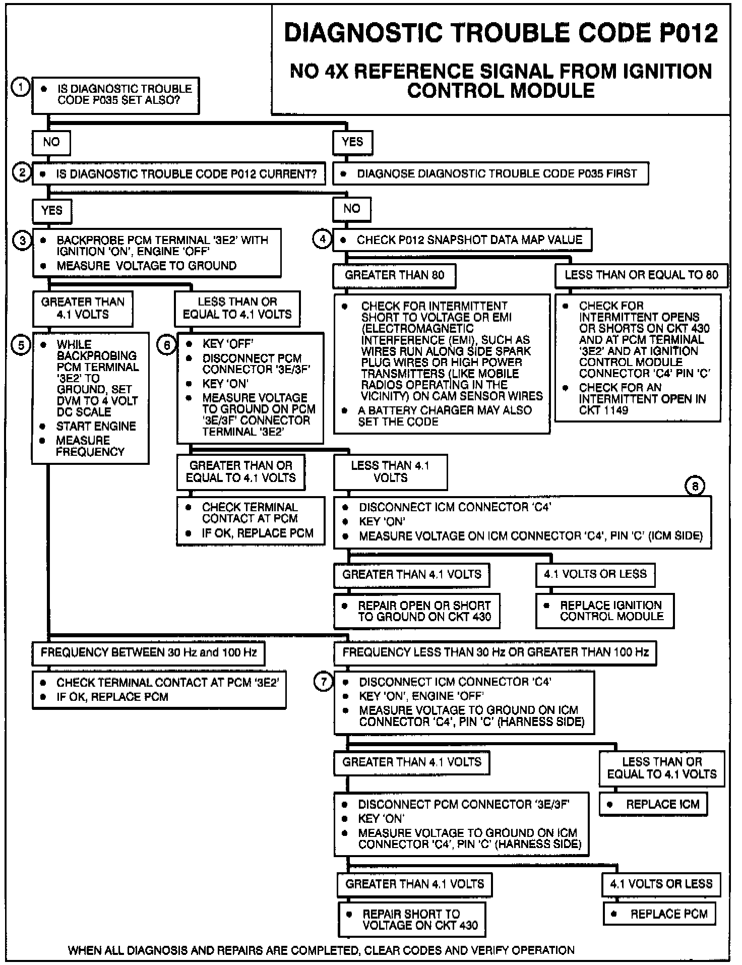 5. Checking for 4X reference pulses on CKT 430 from the Ignition Control Module to the PCM. If PCM terminal "3E2" has between 30 and 100 Hertz the PCM is receiving 4X reference pulses.