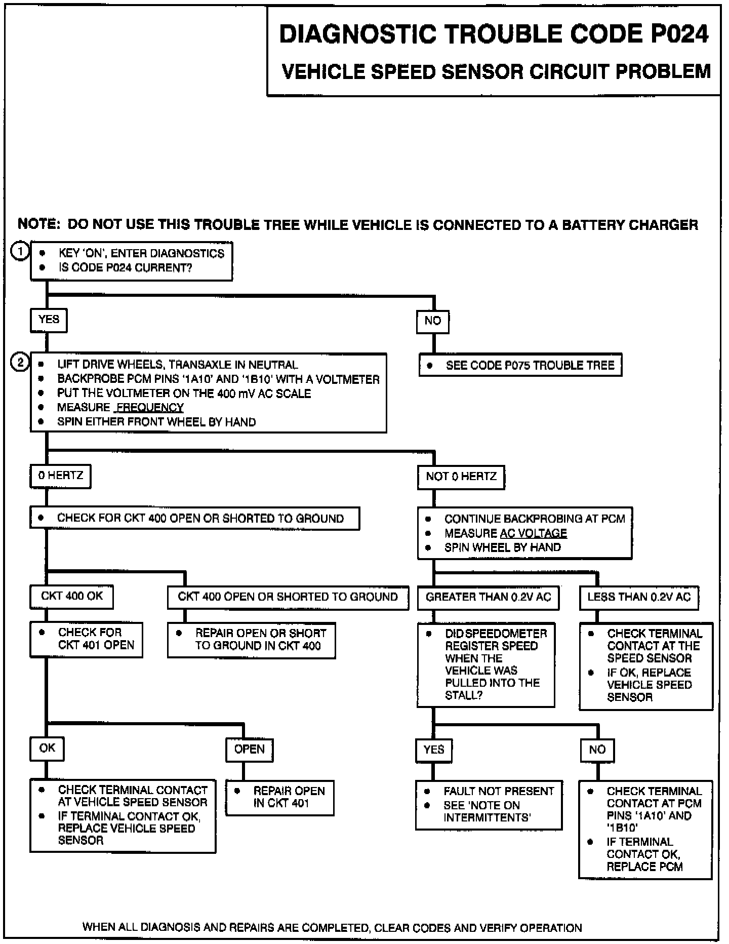 2. The vehicle speed sensor will generate a frequency of greater than 0 Hertz when spun by hand. If it does, the PCM is at fault. If it does not, check wires/sensor for opens and shorts.