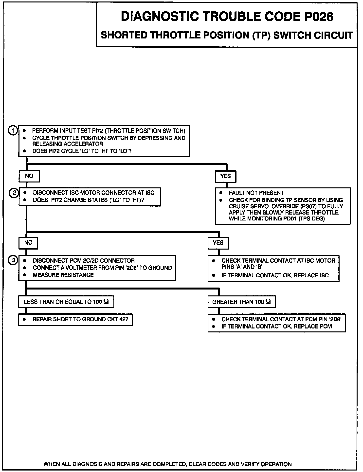 The Throttle Position (TP) switch is part of the Idle Speed Control (ISC) motor. The Powertrain Control Module (PCM) provides a 5 volt reference on CKT 427 to the Throttle Position switch. When the throttle contacts the ISC plunger, the throttle position switch closes. When the throttle position switch is closed the input voltage is low. Code P026 sets when the PCM sees a throttle position sensor signal greater than 15.7 degrees (accelerator being applied) but the throttle position switch remains closed.