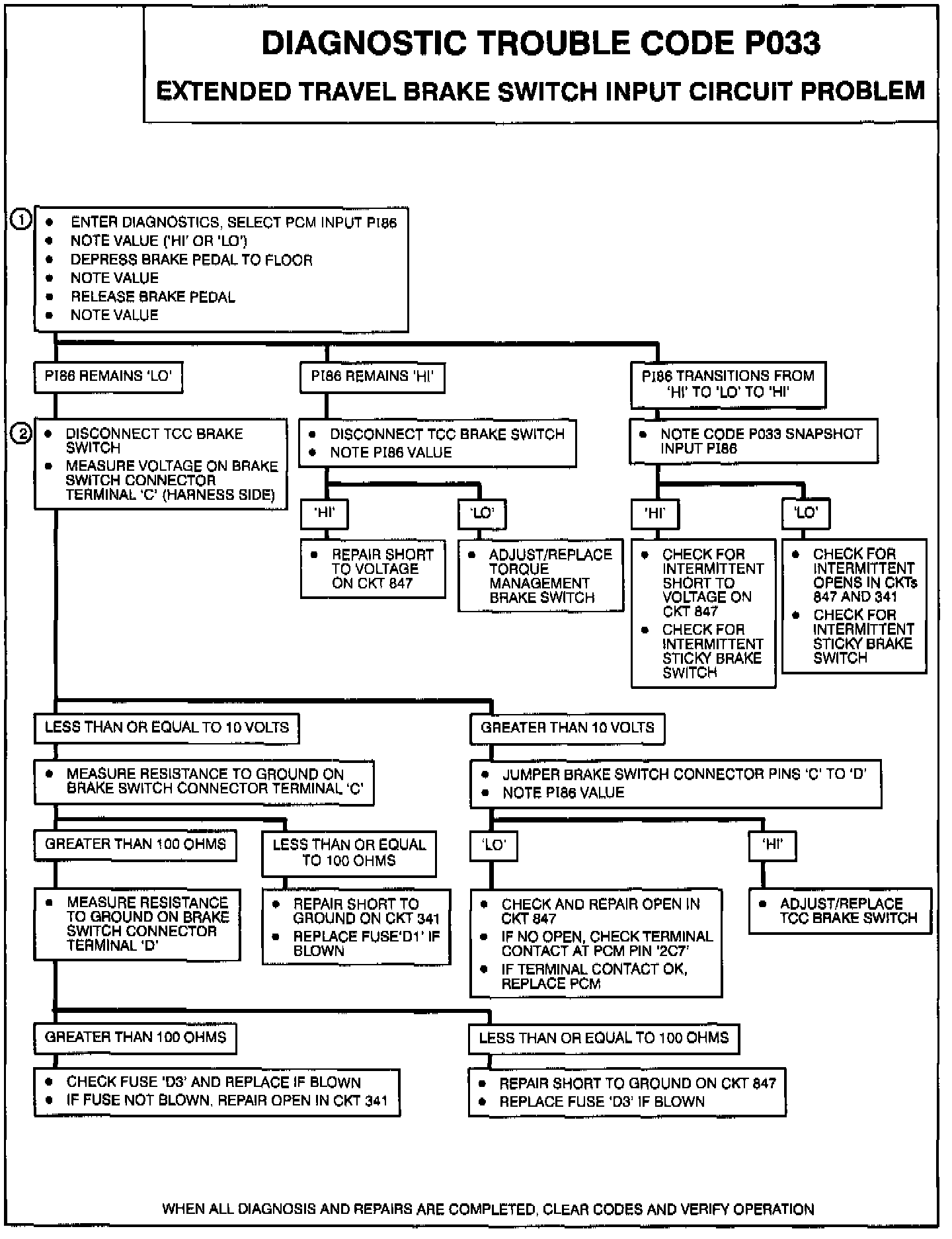 1. PCM input P186 should cycle from "HI" to "LO" to "HI" when brake pedal is depressed and then released. If P186 remains "LO," there is an open or short to ground in the system. If P186 remains "HI," there is a short to voltage in the system.