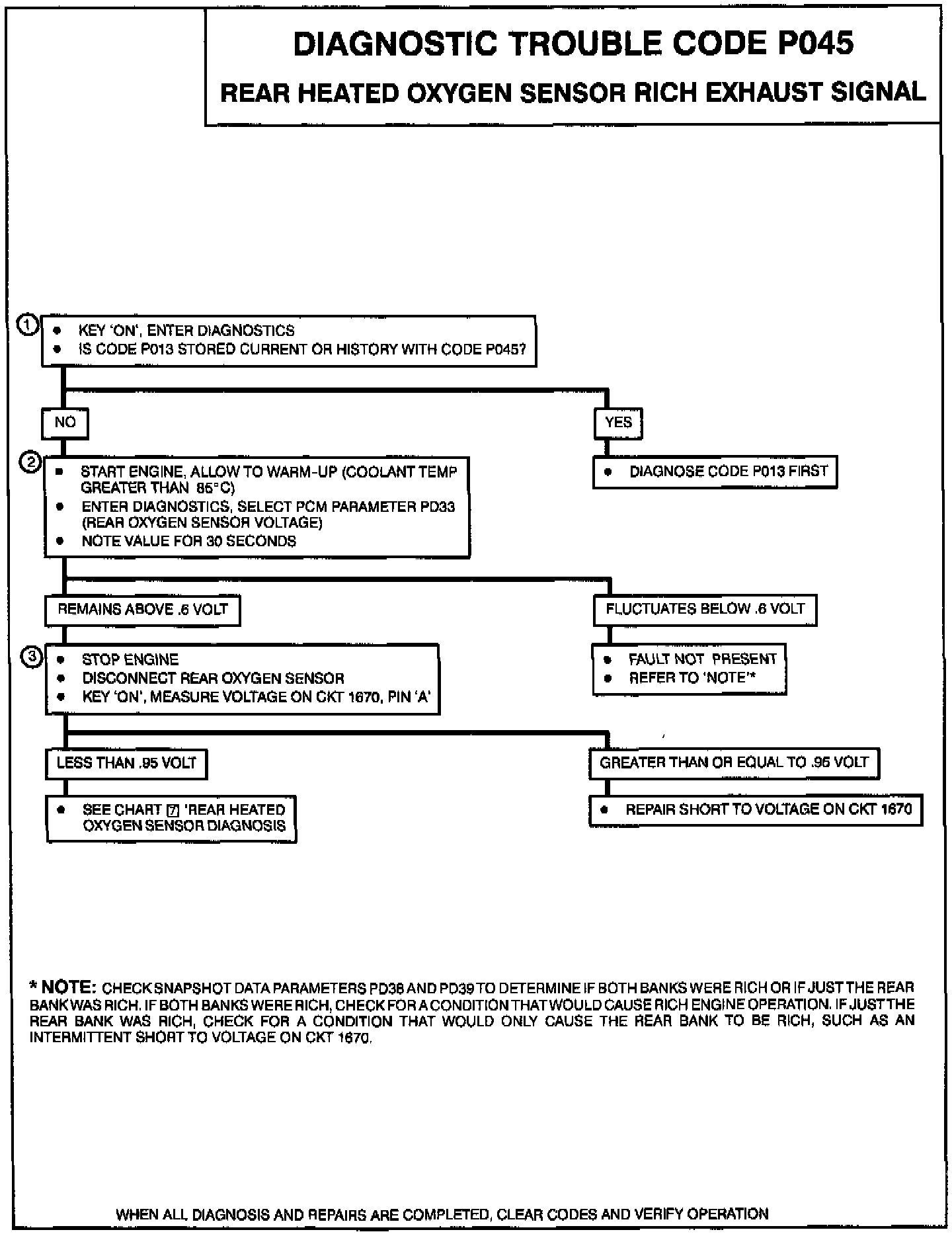 The Powertrain Control Module (PCM) provides a 0.45 volt reference signal to the oxygen sensor on CKT 1670. When the oxygen sensor is cold (below 200°C), the oxygen sensor signal voltage will be around 0.45 volt and the PCM will keep the system in open loop operation. When the oxygen sensor is warm (above 200°C), the oxygen sensor will swing from rich to lean rapidly, at least one swing every two seconds, if the PCM is in good control of the air fuel mixture. Code P045 is designed so that if the oxygen sensor stays at a rich voltage for more than 50 seconds during the test conditions, Code P045 will set. Code P045 will set when: