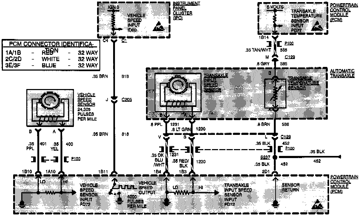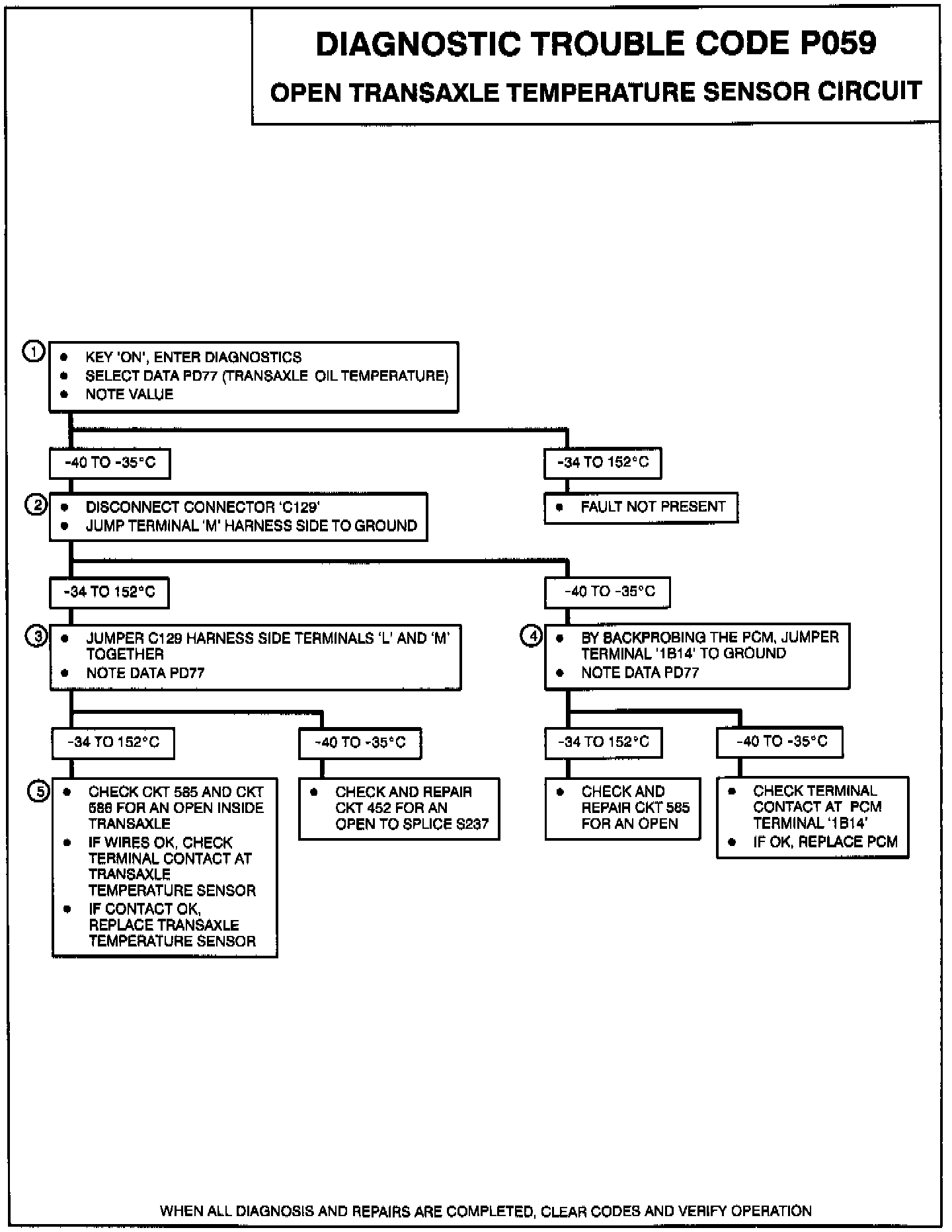 The transaxle temperature sensor is a thermistor, or variable resistor whose resistance varies based on its temperature. As the temperature of the sensor increases, its resistance decreases. A low transaxle temperature will result in high signal voltage on CKT 585. Code P059 sets when the Powertrain Control Module (PCM) sees a transaxle temperature sensor reading of -35°C or less (4.95 volts or greater).