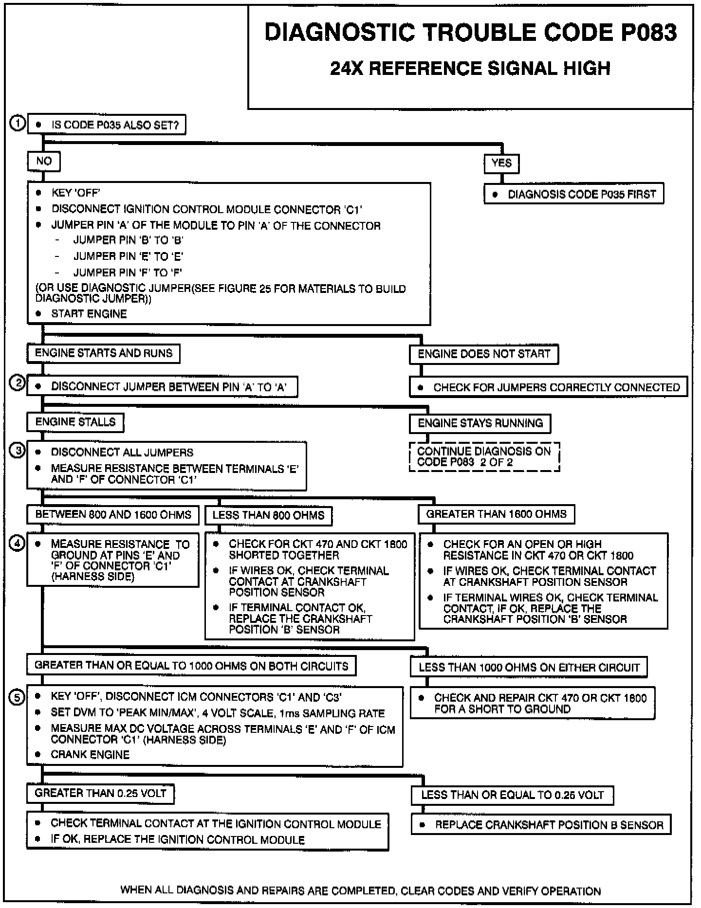 This diagnostic test checks for 24X signal at a logic high condition. The fault could be induced by the failure of either Crankshaft Position A or B Sensor input signal to the Ignition Control Module (ICM). Under such a condition, the ICM would force the 24X signal high. This test also checks for 24X shorted to battery externally. If either condition is met, Code P083 is set.