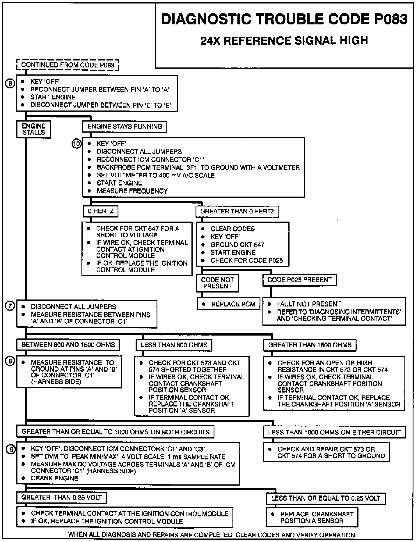 6. If engine stalls, the problem is with crankshaft position "A" sensor. If the engine remains running, the ignition control module or CKT 647 are shorted high.