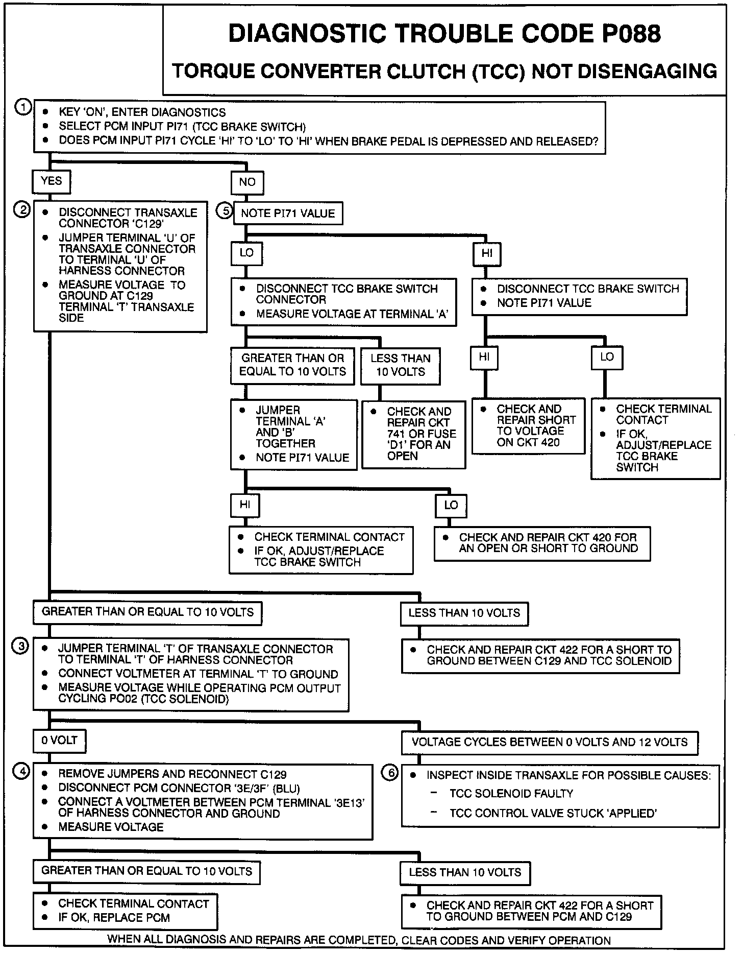 5. If PI71 stays "HI," check for a short to voltage in the TCC control circuitry. If P171 stays "LO," check CKT 741 for an open or CKT 420 for an open or short to ground.