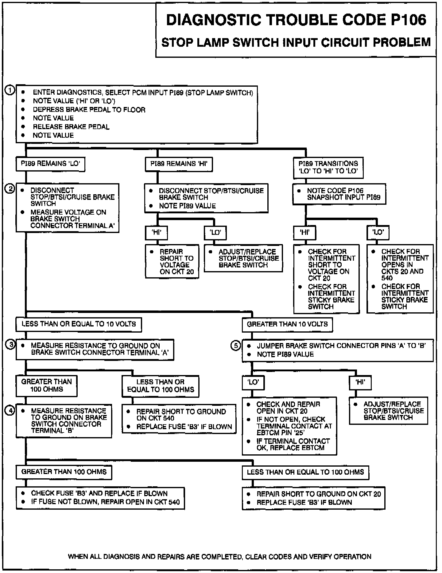 1. Checking if PCM input test PI89 will cycle when brake pedal is depressed and released. If PI89 remains "HI," check for a short to voltage in the system. If PI89 remains "LO," check for an open or short to ground in the system.