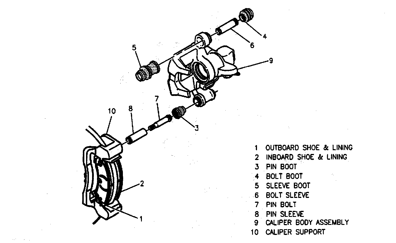 7. Caliper body assembly. Pivot caliper body assembly up to clear rotor and then slide it inboard off pin sleeve.