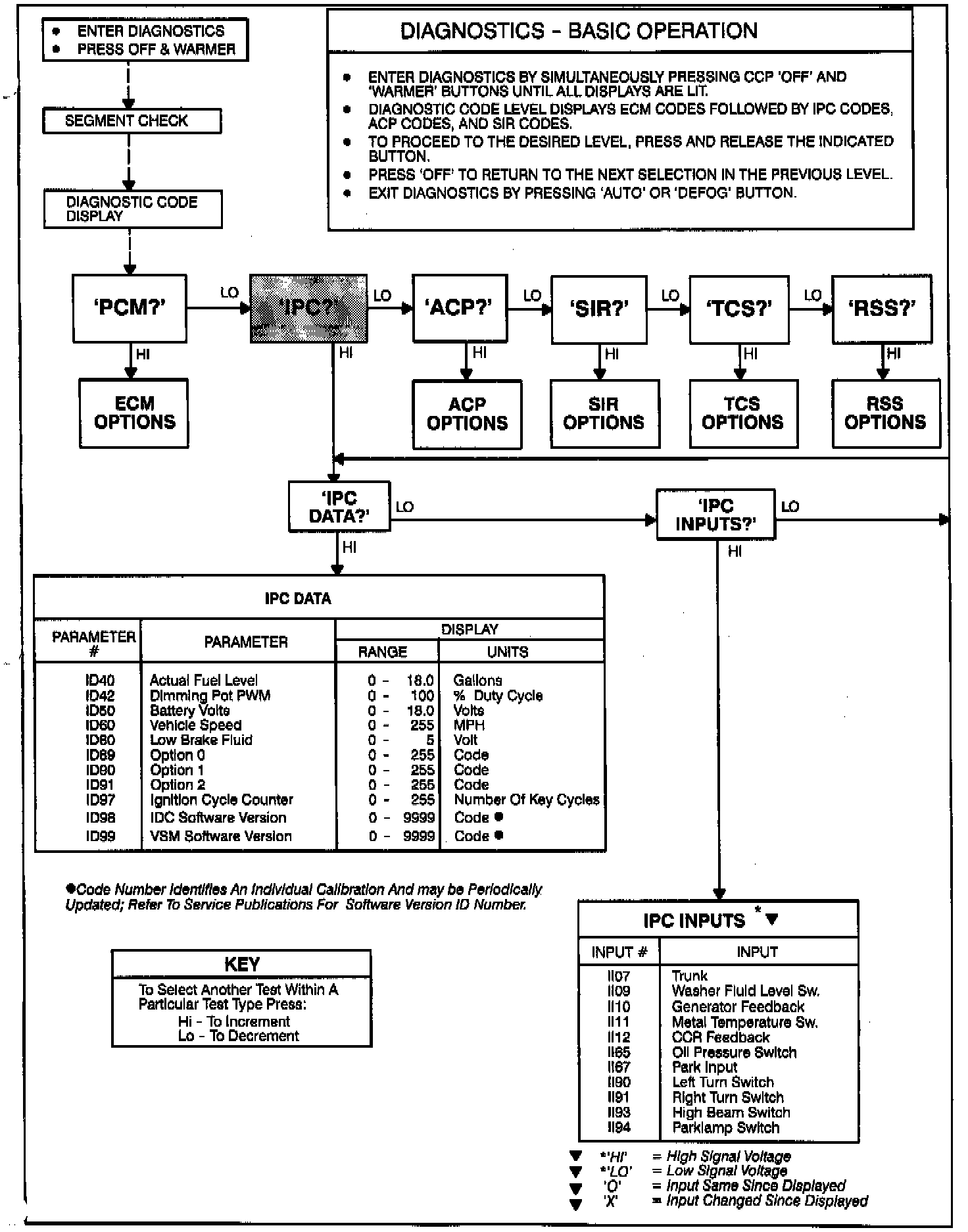 After entering On-Board Diagnostics, a segment check is automatically performed and then any trouble code stored in computer memory will be displayed. Codes may be stored for the Powertrain Control Module (PCM), Instrument Panel Cluster (IPC), Air Conditioning Programer (ACP), Supplemental Inflatable Restraint (SIR) Traction Control System (TCS) or Road Sensing Suspension (RSS) systems.
