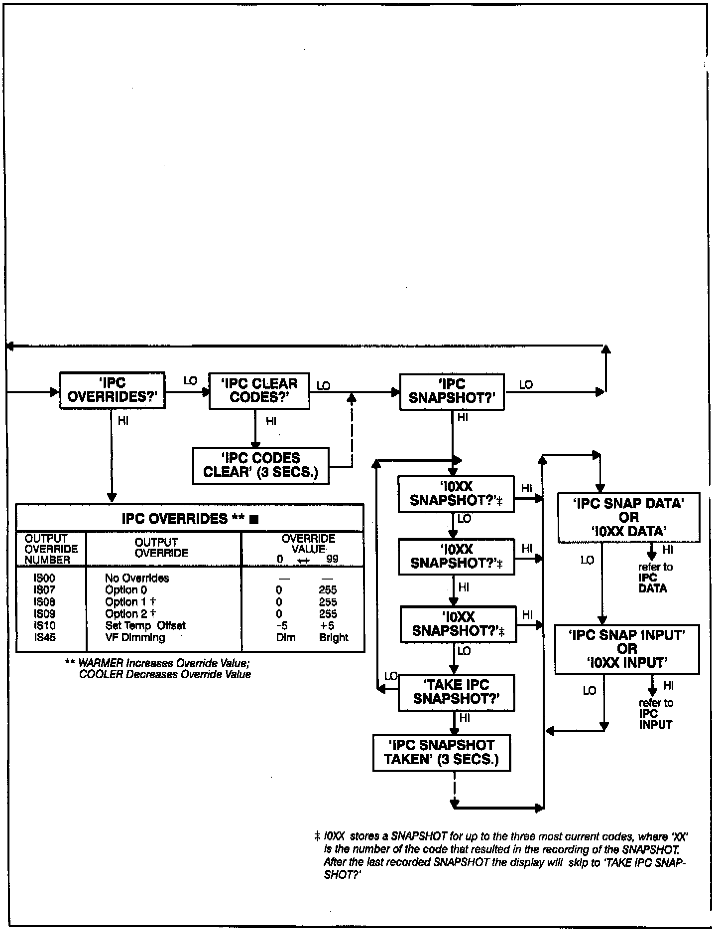If no codes are present for a system, a "NO X CODE" message (with "X" being the system i.e. E, I, A, R, T or S) will be displayed. If the communication line to a component is not operating, a "NO X DATA" message will be displayed, indicating that the IPC could not communicate with that system.